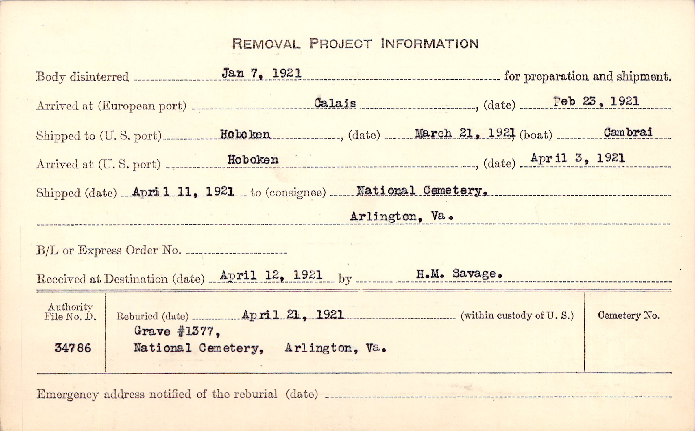Body disinterred 1/7/1921 for preparation and shipment.