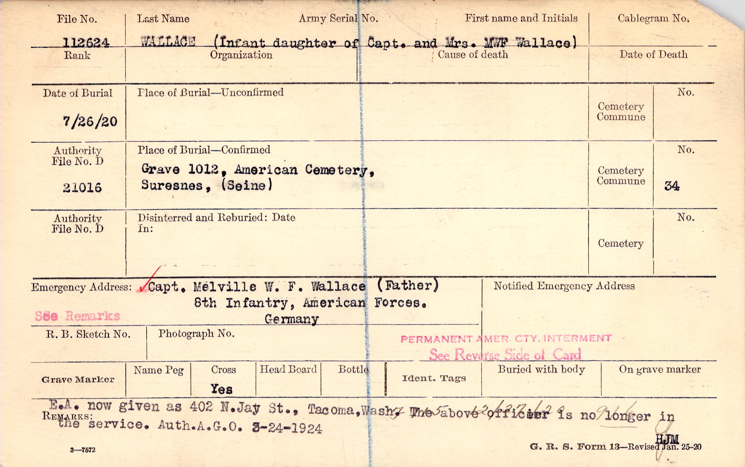 Other notations: Infant daughter of Capt. and Mrs. MWF Wallace