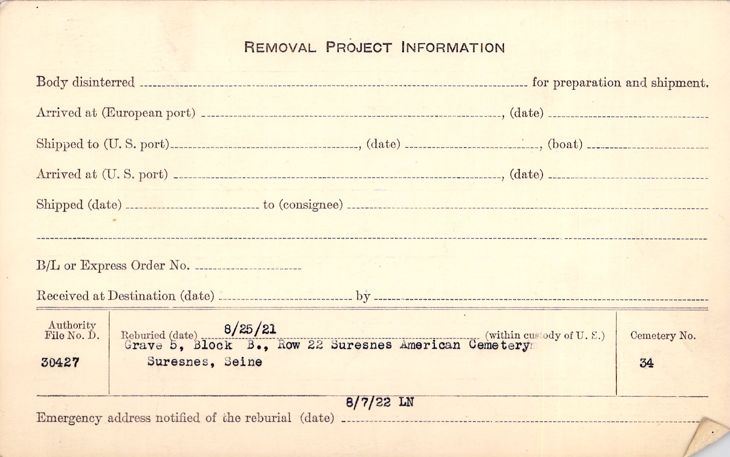 | Permanent Burial in Foreign Cemetery |