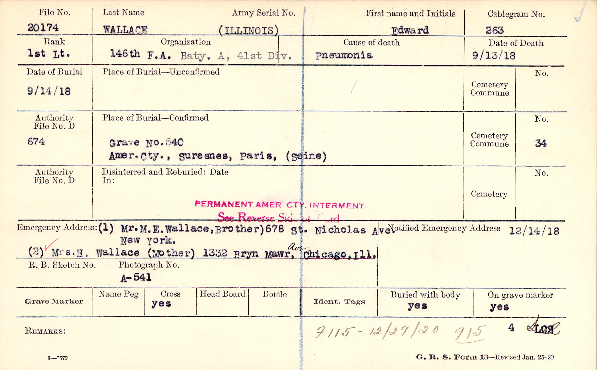 Mr.M.E.Wallace,Brother), 678 St. Nicholas Ave. New York, (2) Mrs.H. Wallace (Mother) 1332 Bryn Mawr Ave, Chicago, Ill.