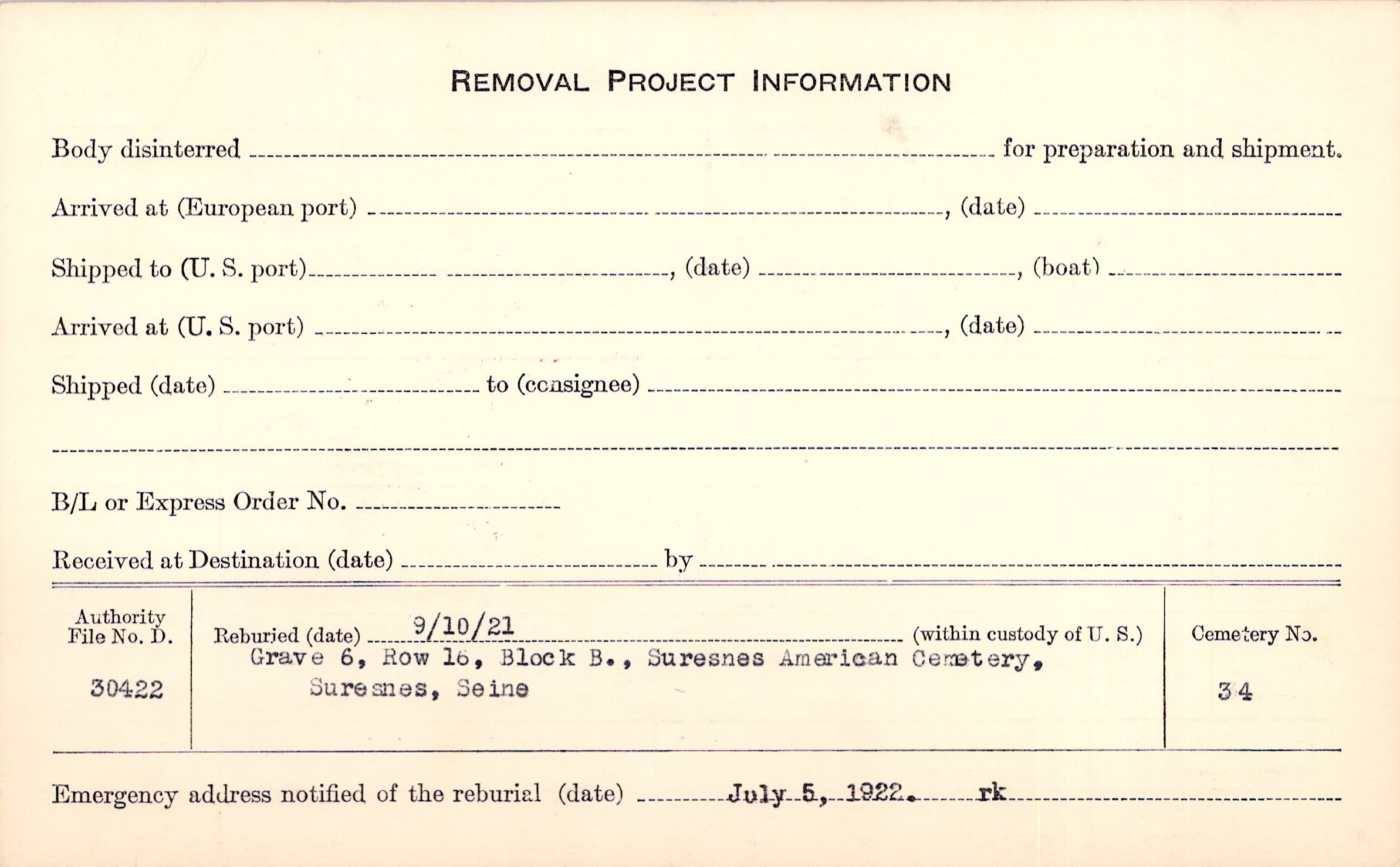 | Permanent Burial in Foreign Cemetery |
