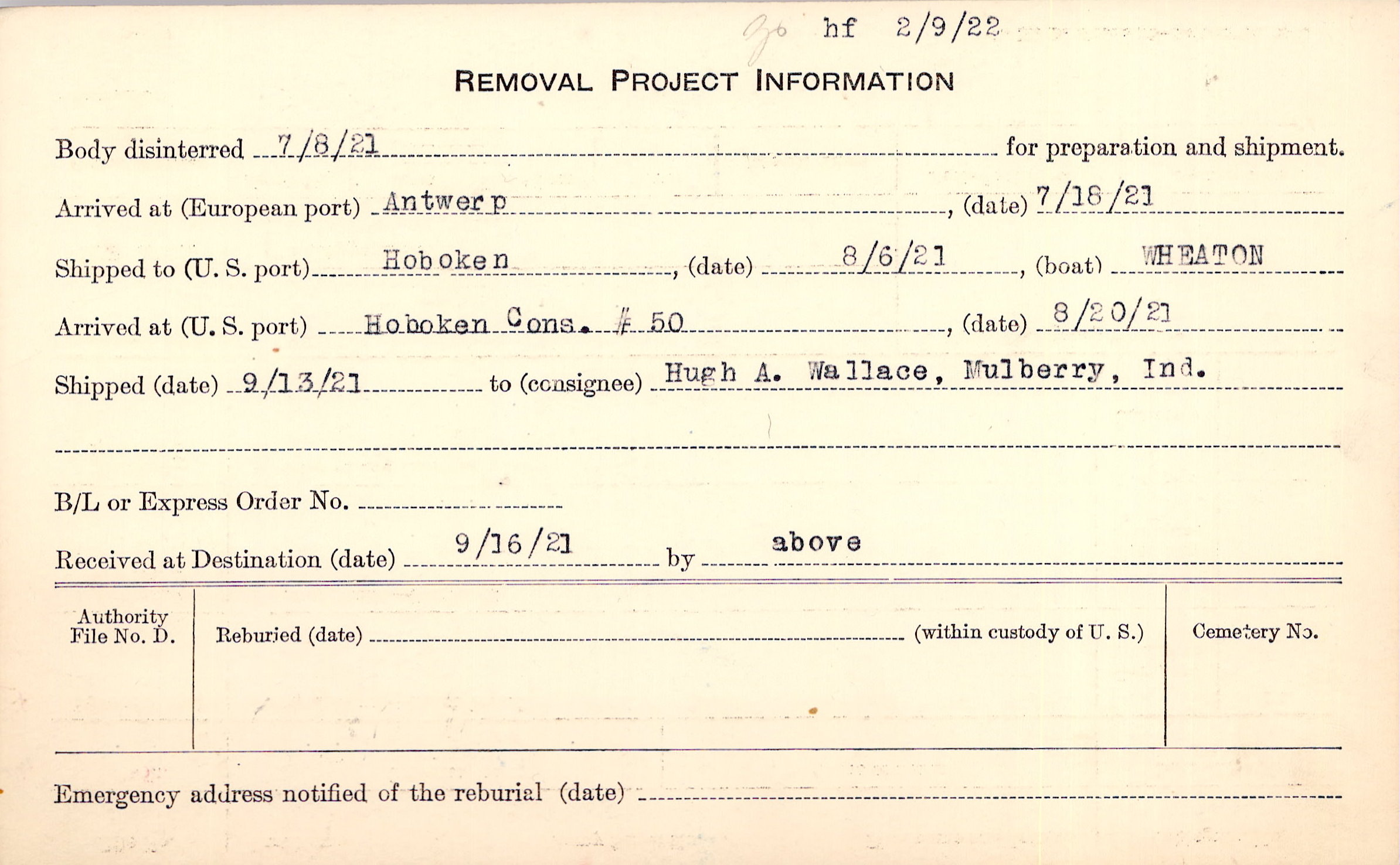 Body disinterred 7/8/1921 for preparation and shipment.