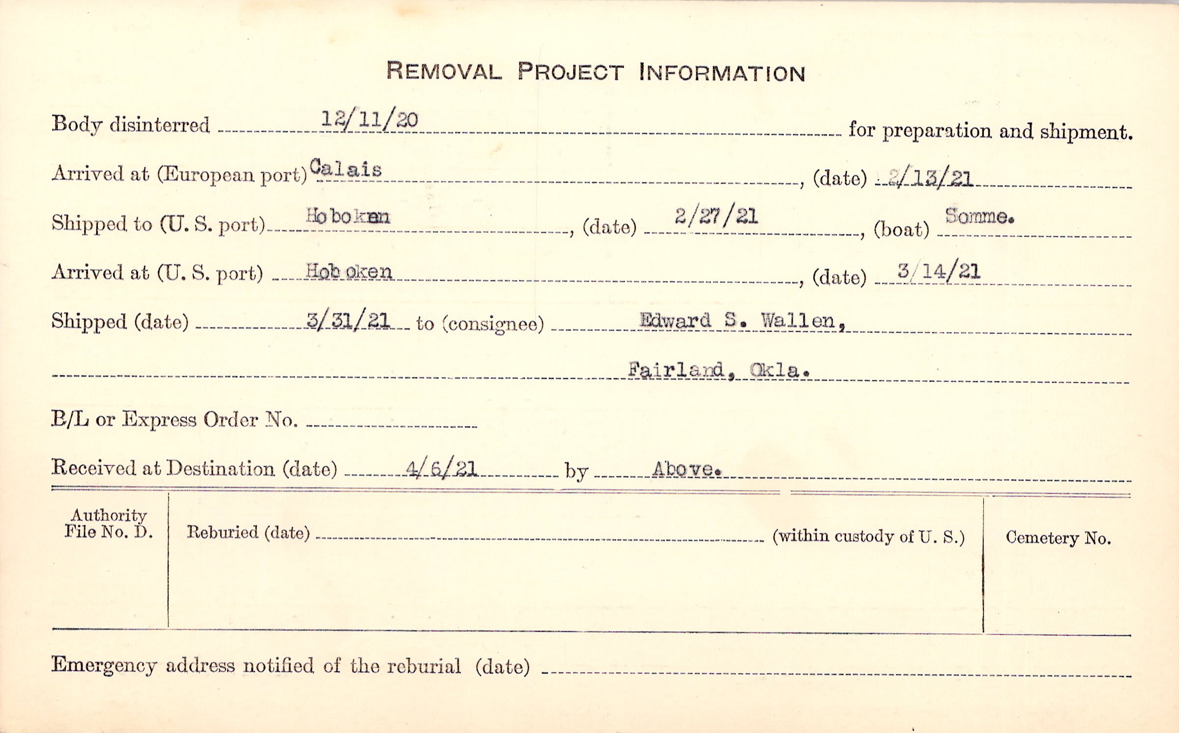 Body disinterred 12/11/1920 for preparation and shipment.