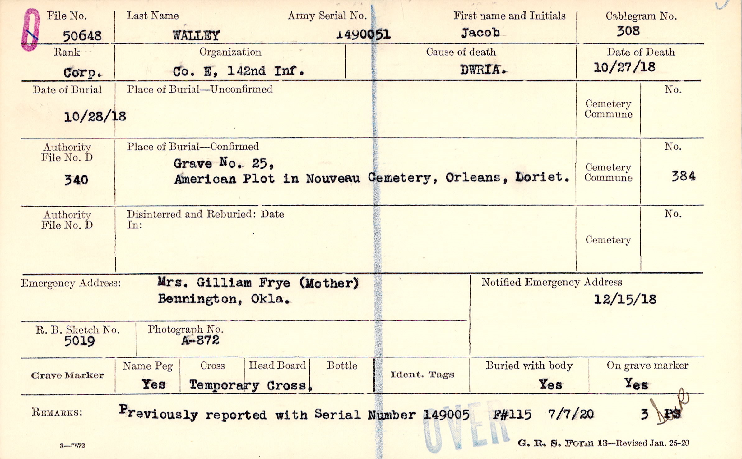 Grave NO. 25, American Plot in Nouveau Cemetery, Orleans, Doriet.