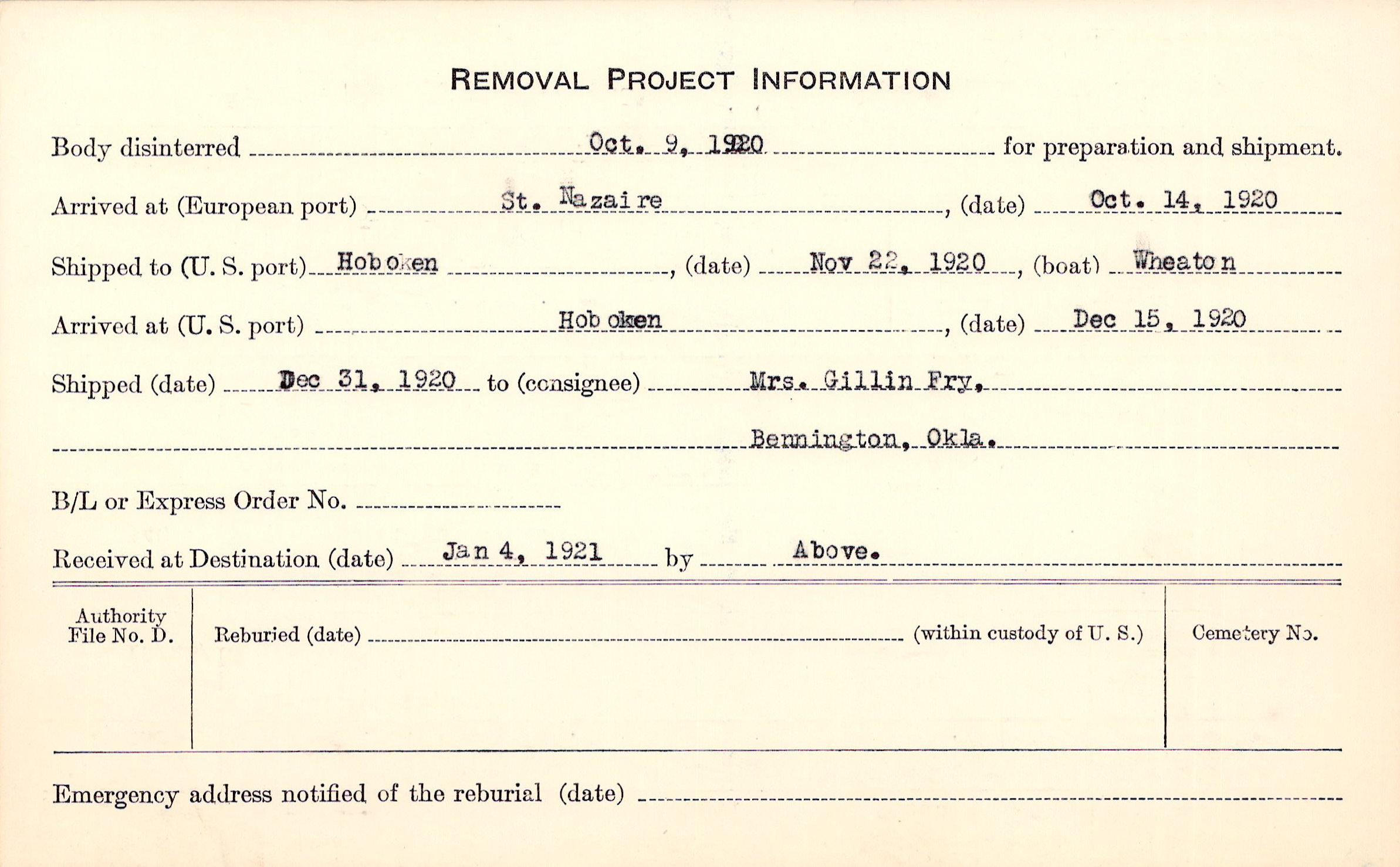 Body disinterred 10/9/1920 for preparation and shipment.