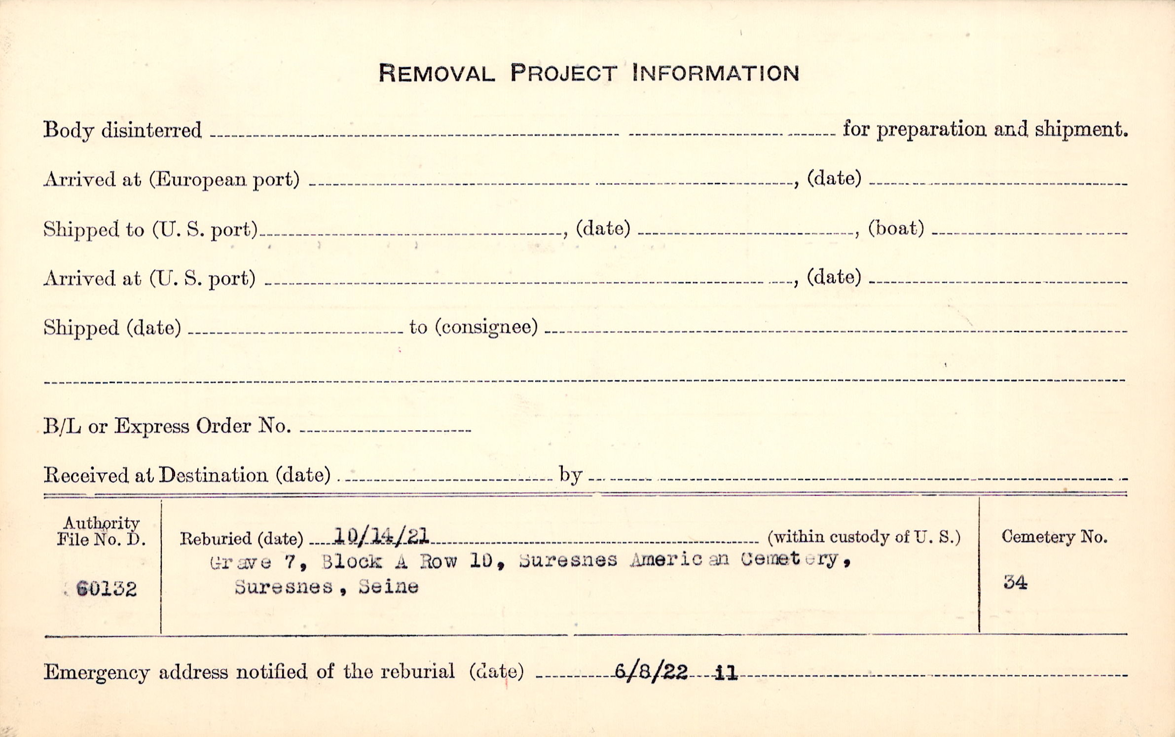 | Permanent Burial in Foreign Cemetery |