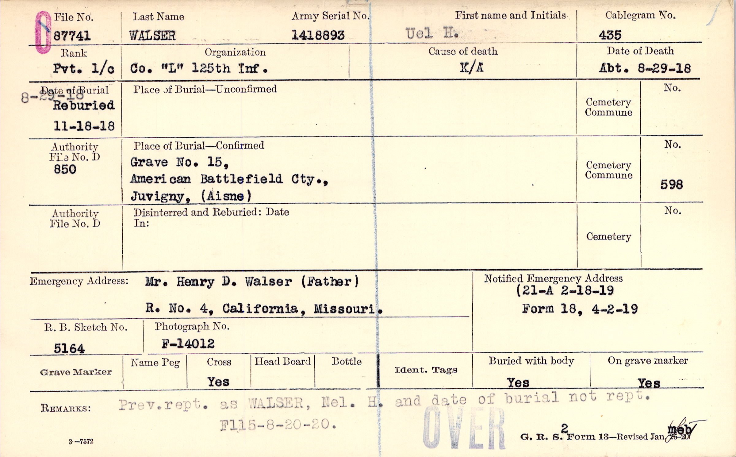 8/29/18 Reburied 11/18/18