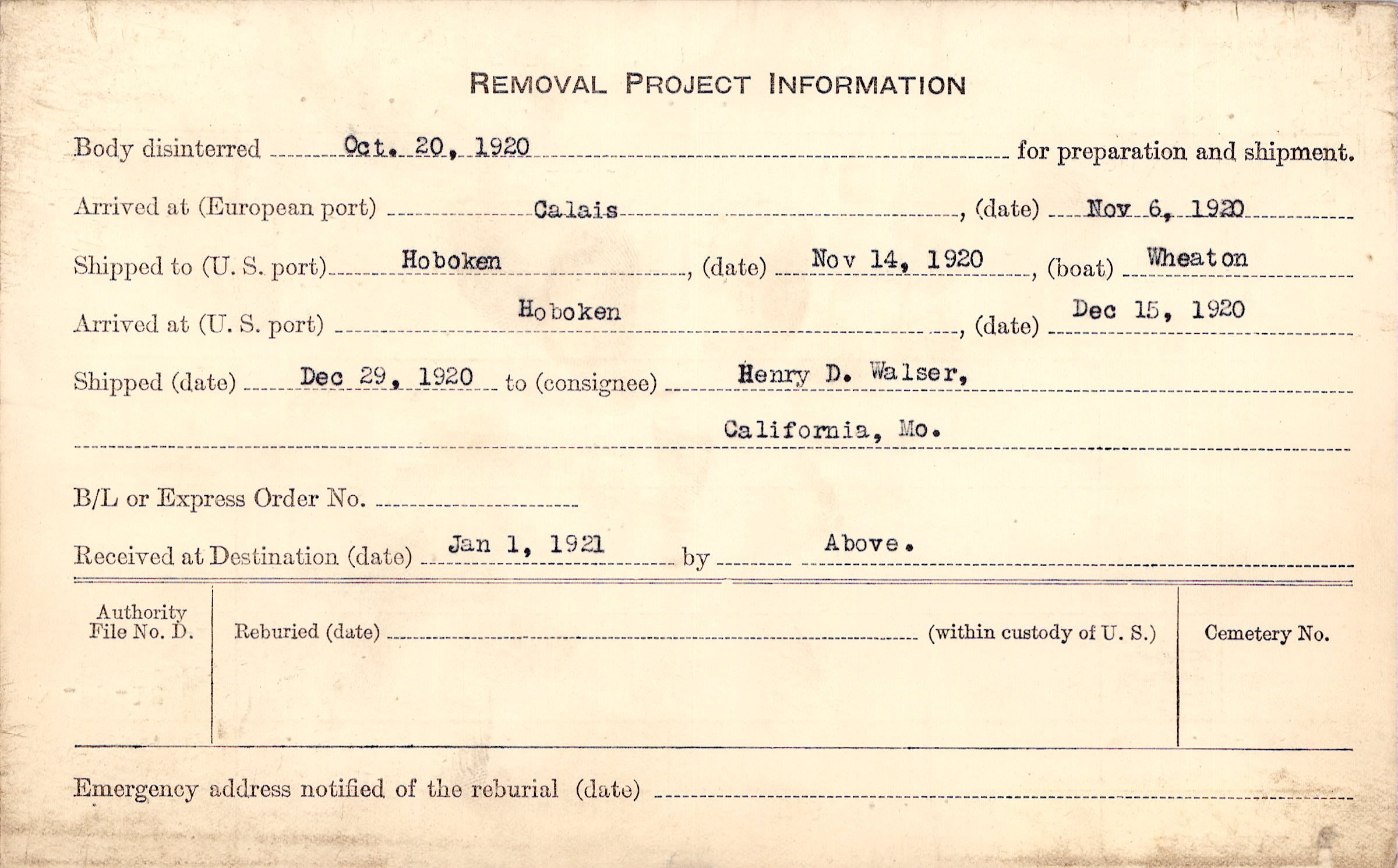 Body disinterred 10/20/1920 for preparation and shipment.
