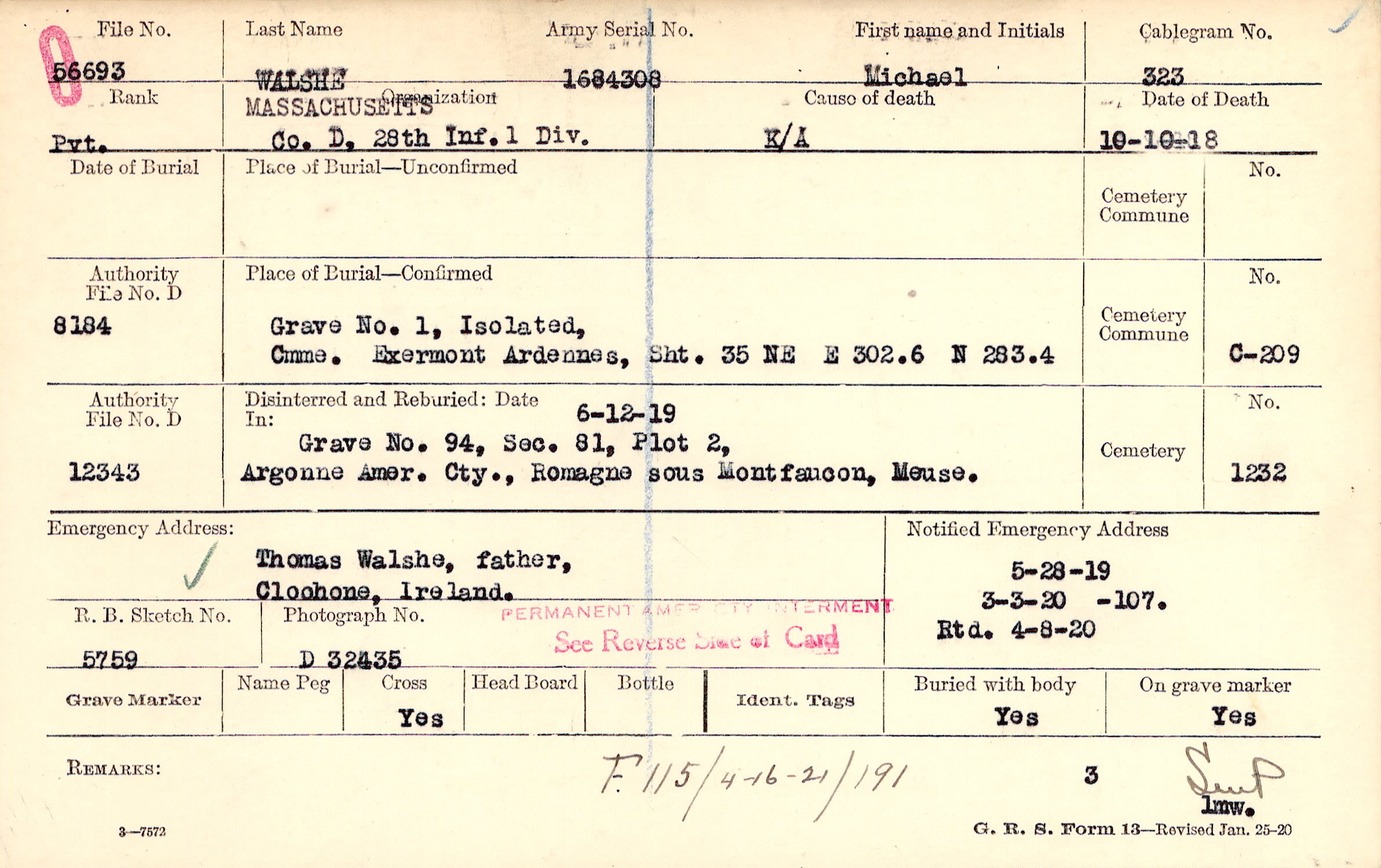 5/28/1919, Form 107: 3/3/1920, Rtd 4/8/1920