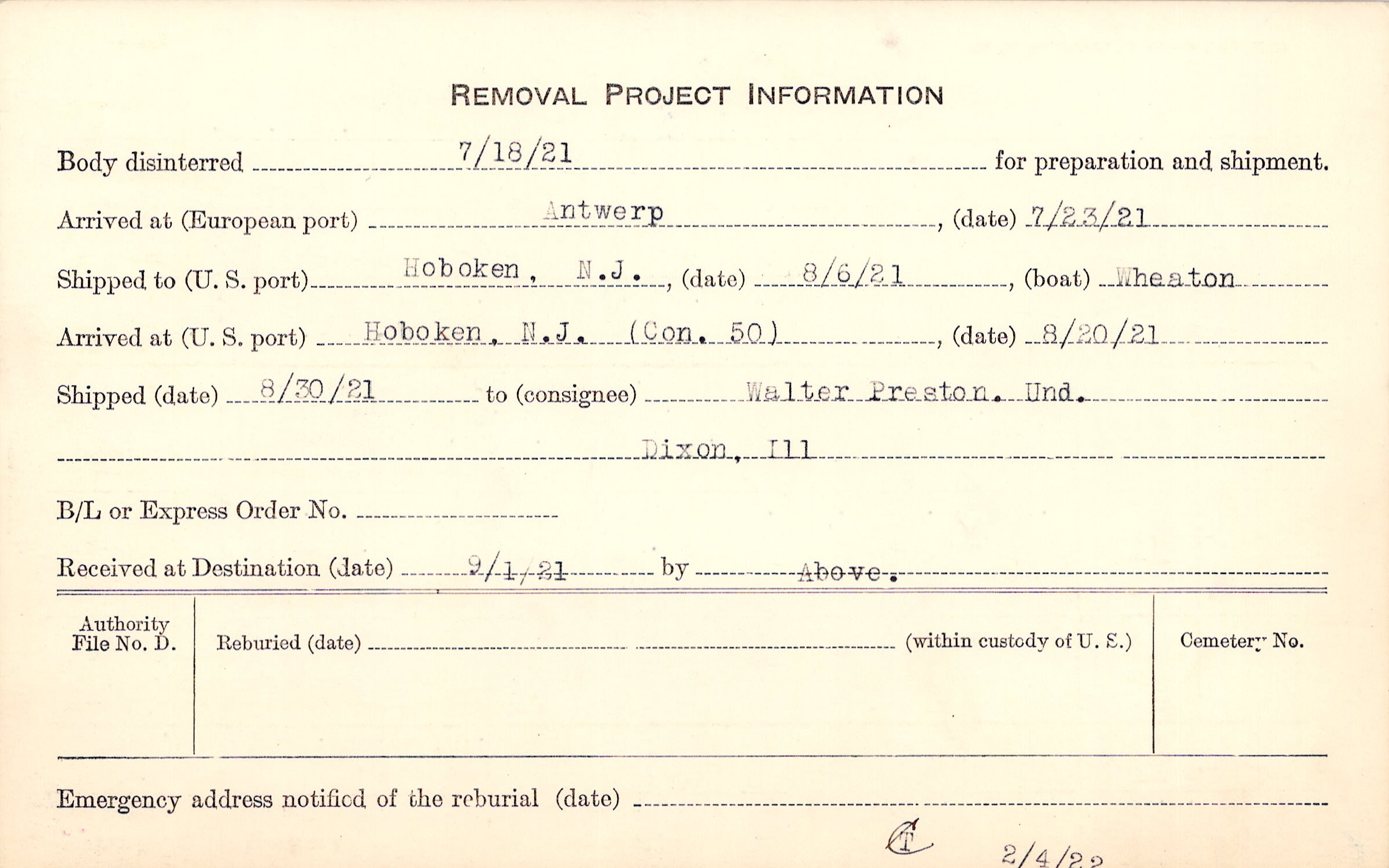 Body disinterred 7/18/1921 for preparation and shipment.