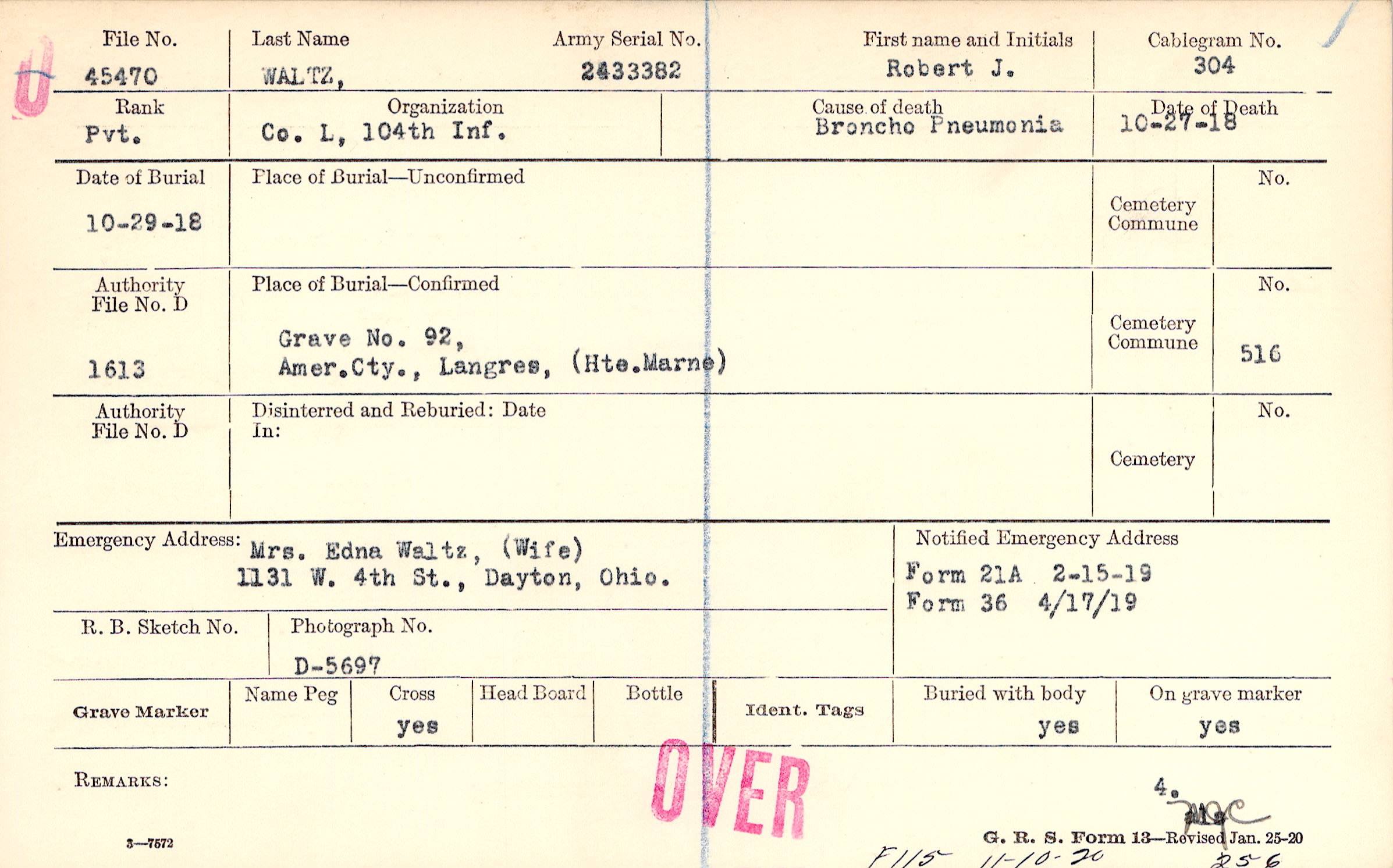 Mrs. Edna Waltz, (Wife), 1131 W. 4th St., Dayton, Ohio.