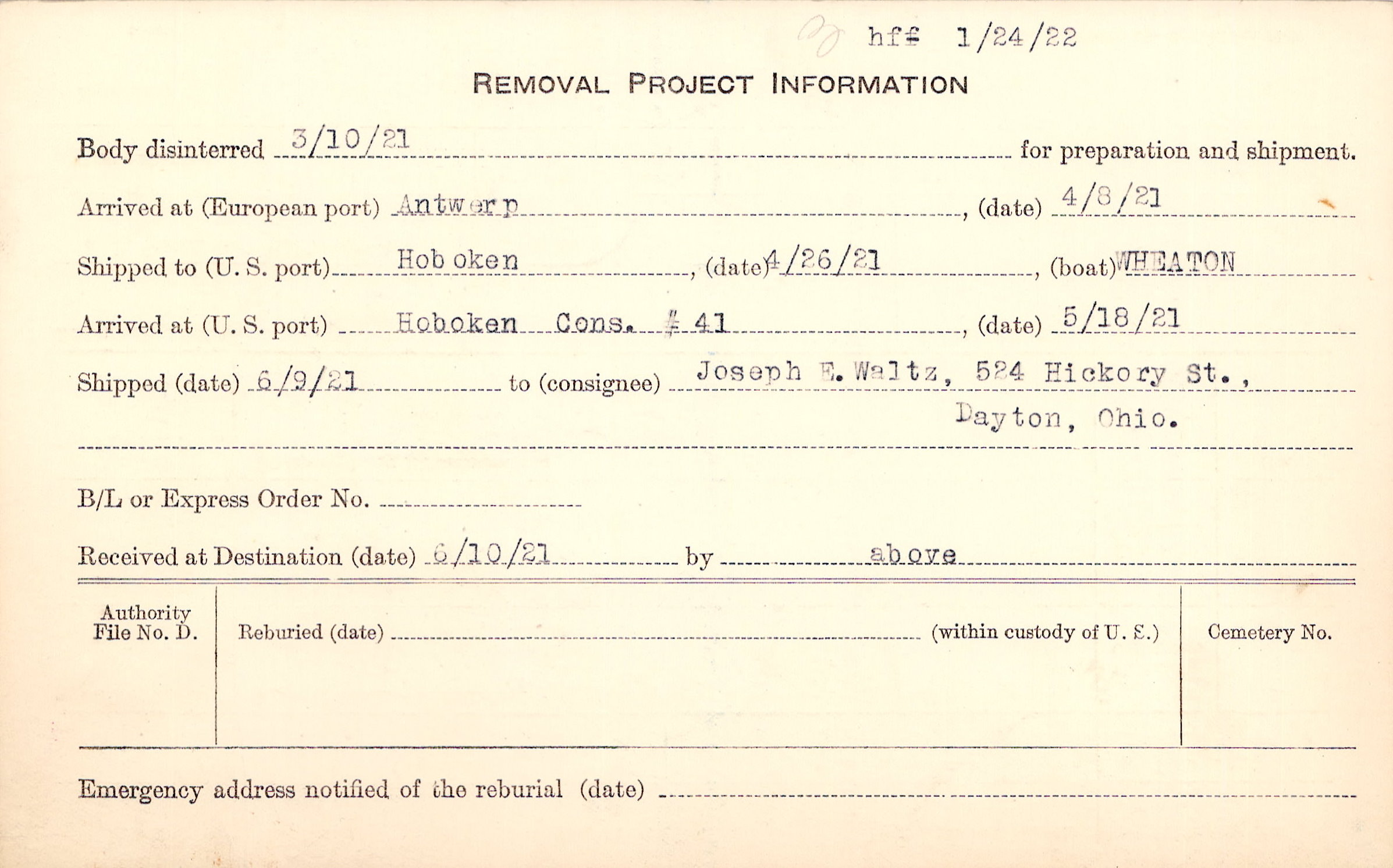Body disinterred 3/10/1921 for preparation and shipment.