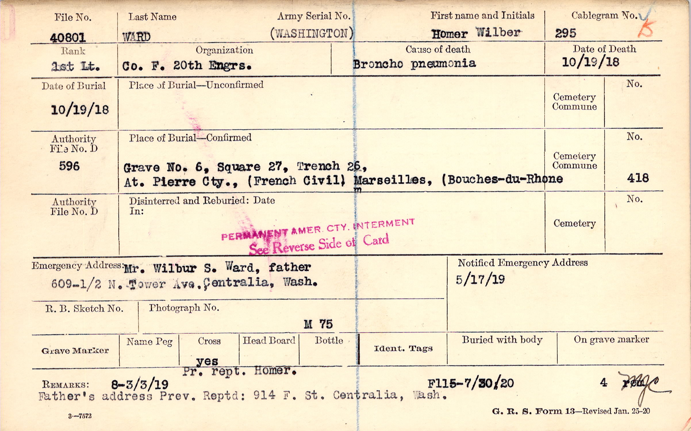 Pr. rept. Homer. Father's address Prev. Reptd: 914 F. St. Centralia, Wash., 8-3/3/19