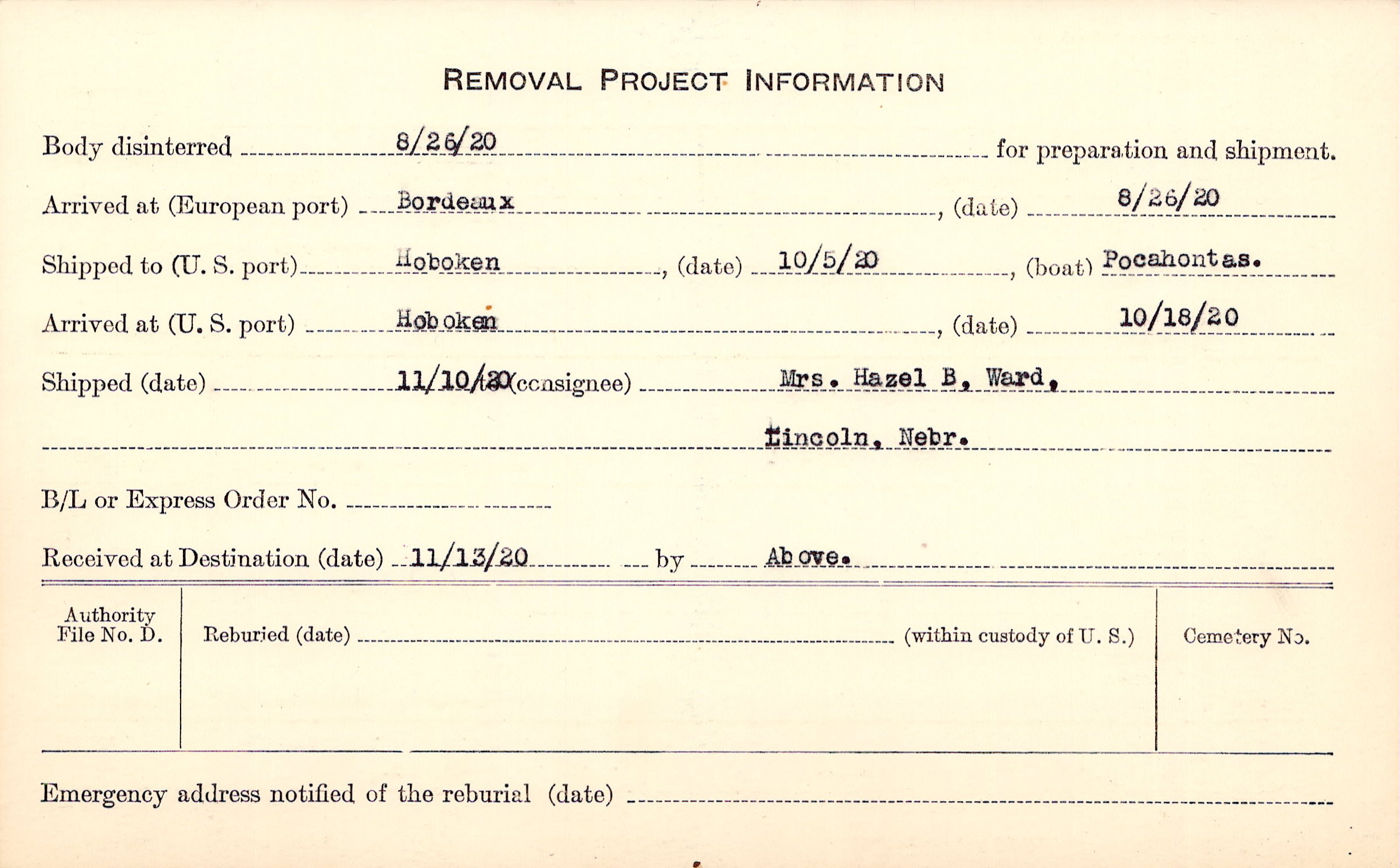Body disinterred 8/26/1920 for preparation and shipment.