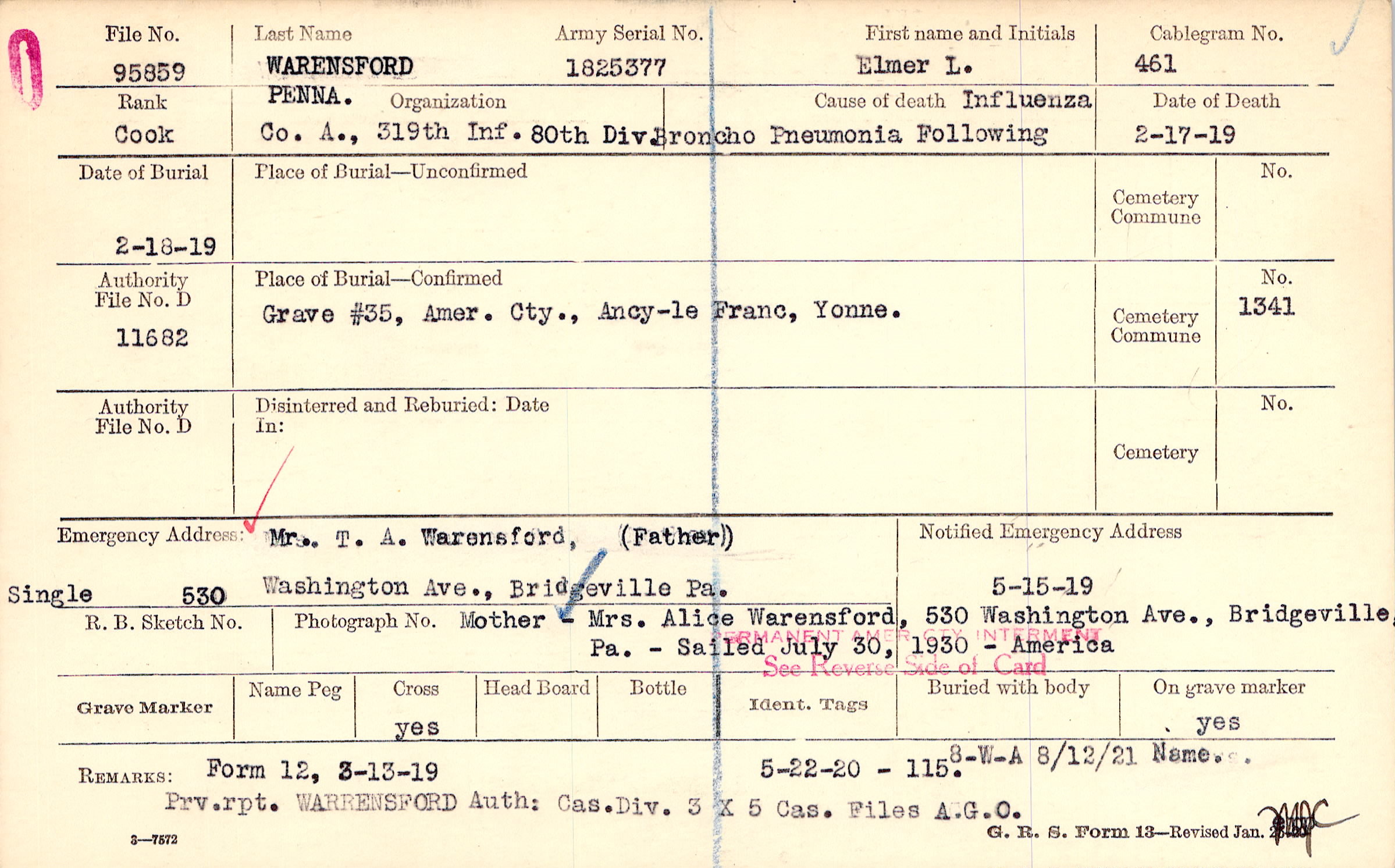Mr. T. A. Warensford, (Father), 530 Washington Ave., Bridgeville Pa., Single Mother - Mrs. Alice Warensford, 530 Washington Ave., Bridgeville, Pa, - Sailed July 30, 1930 - America