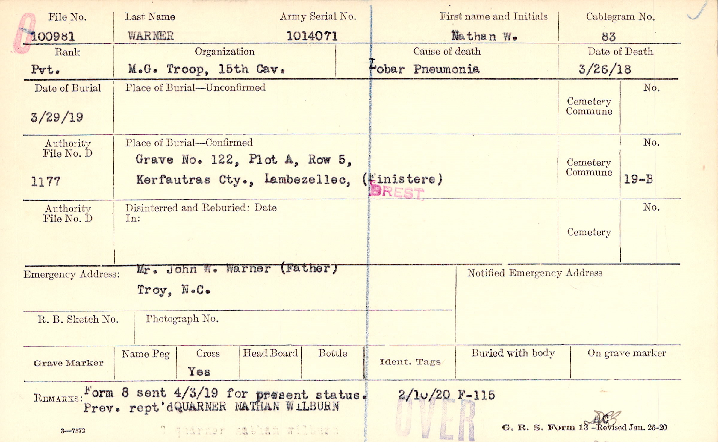 Grave 122, Plot A, Row 5, Kerfautras Cty., Lambezellec, Finistere