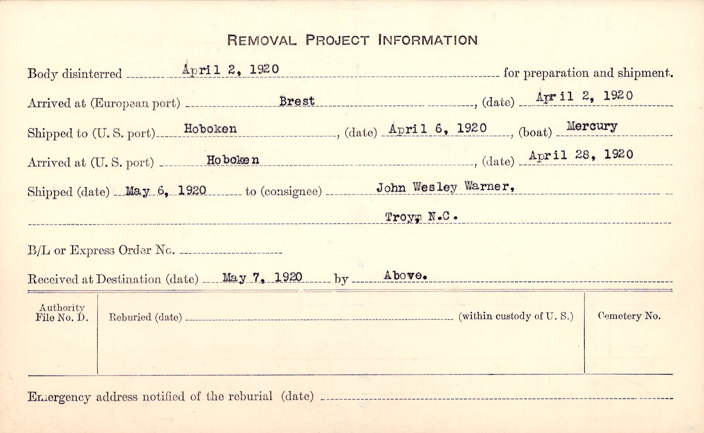 Body disinterred 4/2/1920 for preparation and shipment.