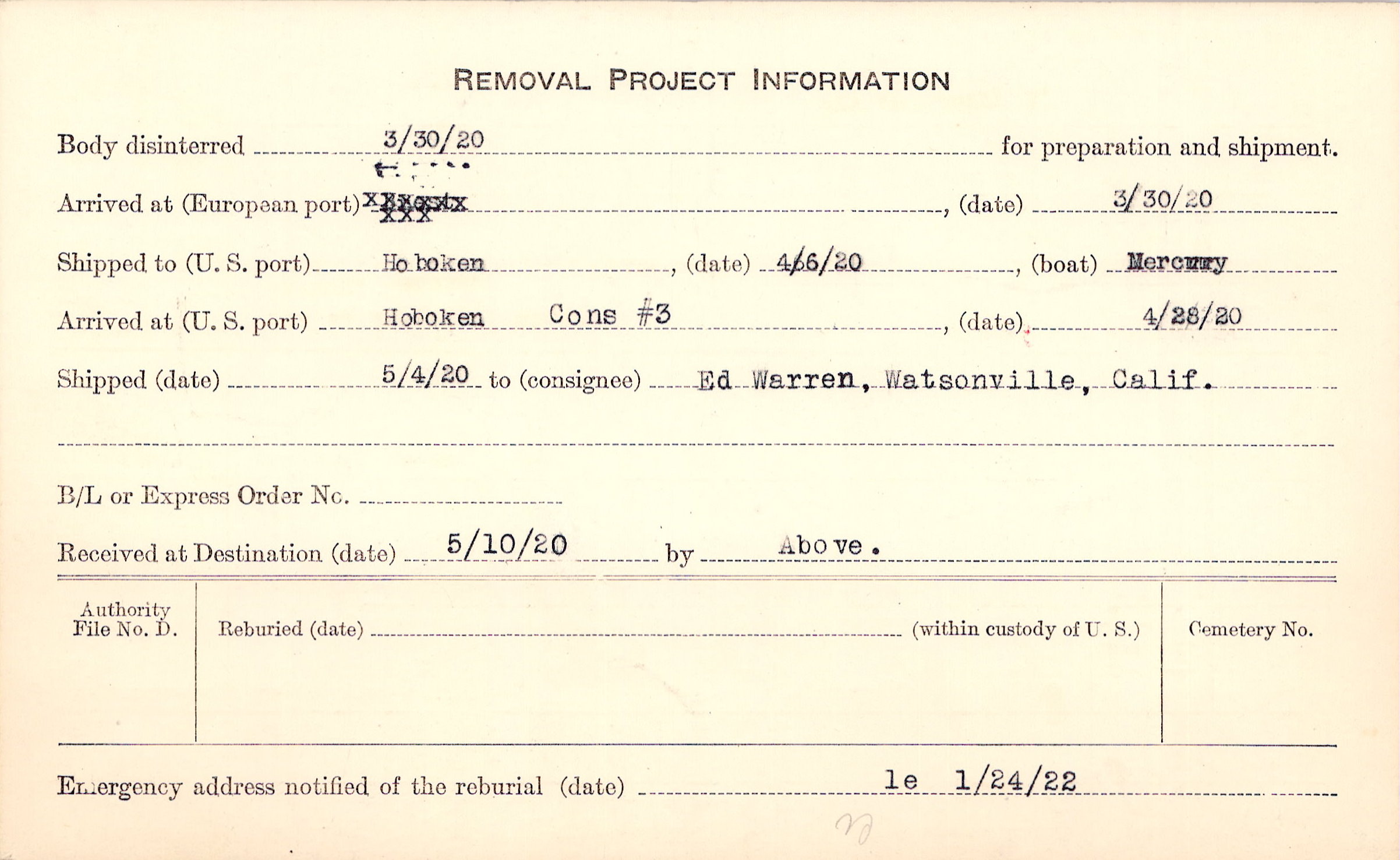 Body disinterred 3/30/1920 for preparation and shipment.