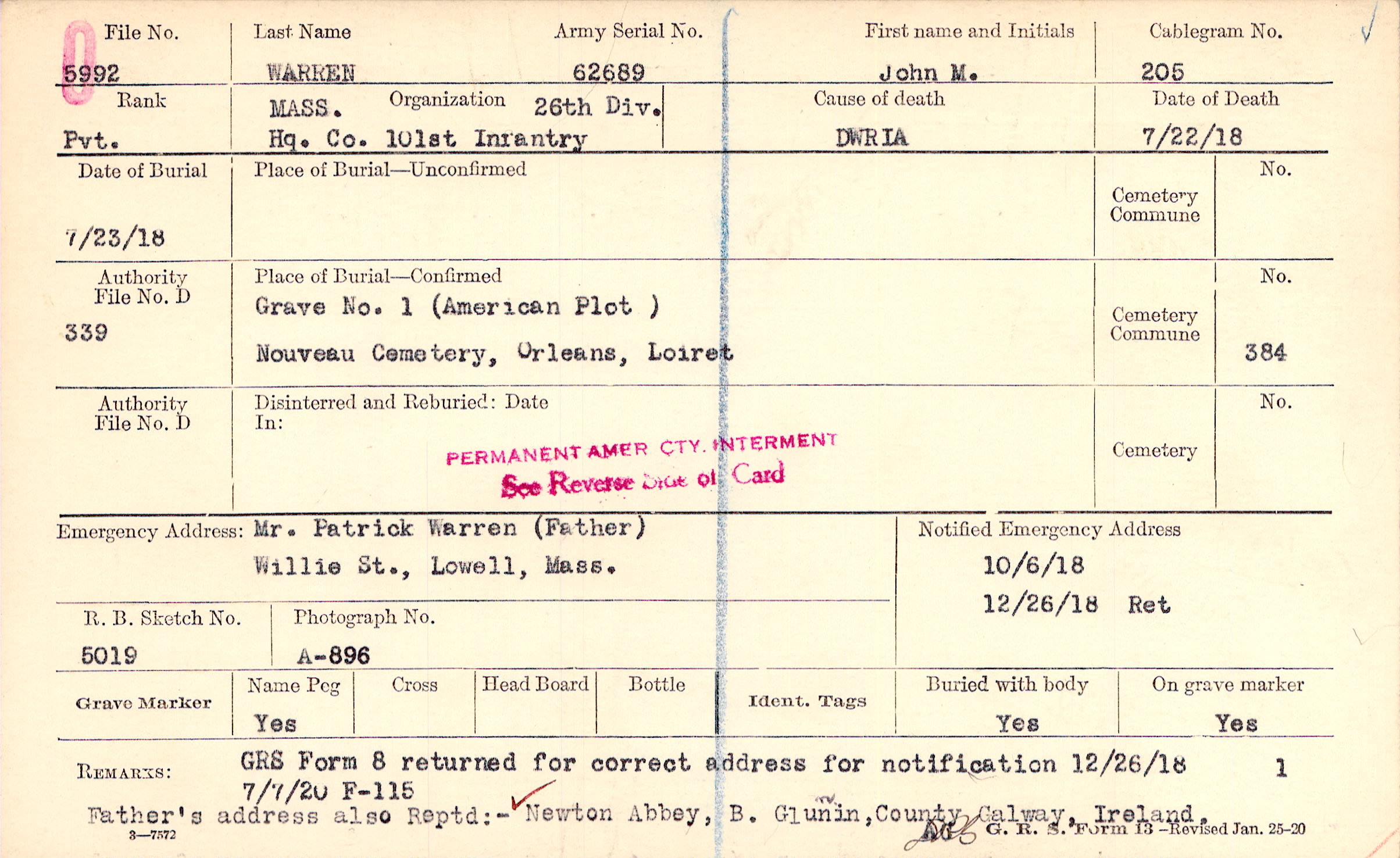 Mr. Patrick Warren (Father), Willie St., Lowell, Mass.