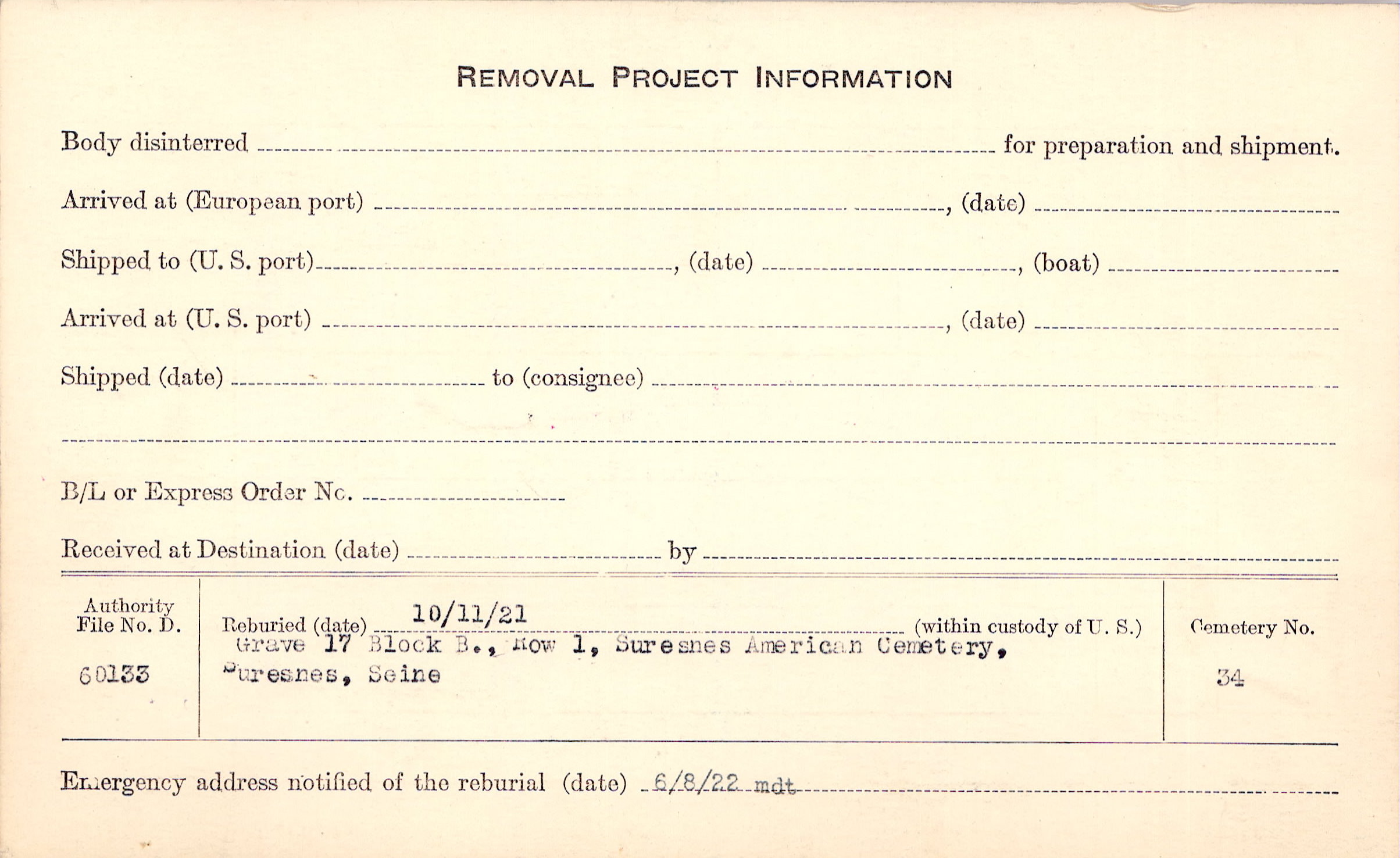 | Permanent Burial in Foreign Cemetery |