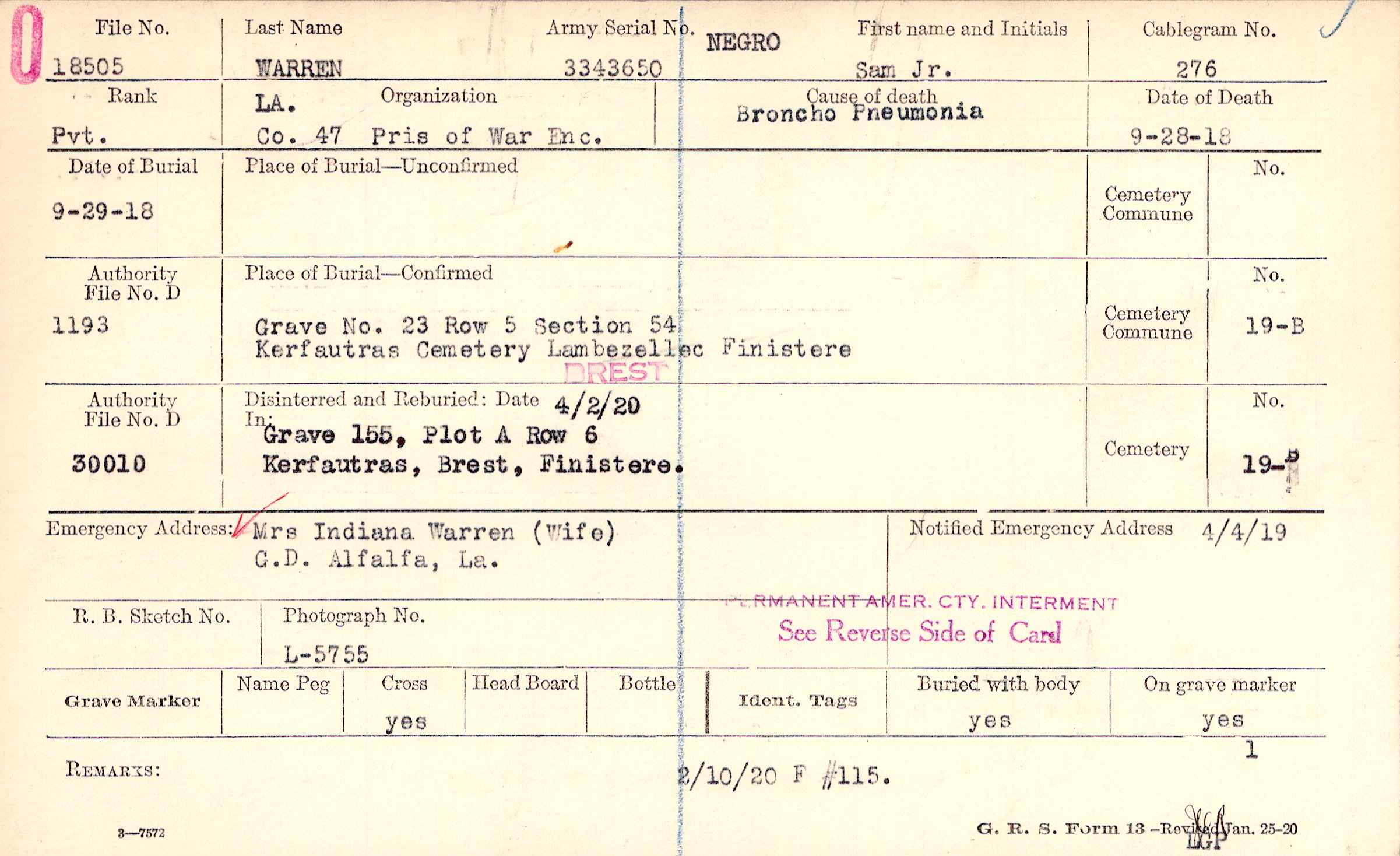 Mrs Indiana Warren (Wife), G.D> Alfalfa, La.