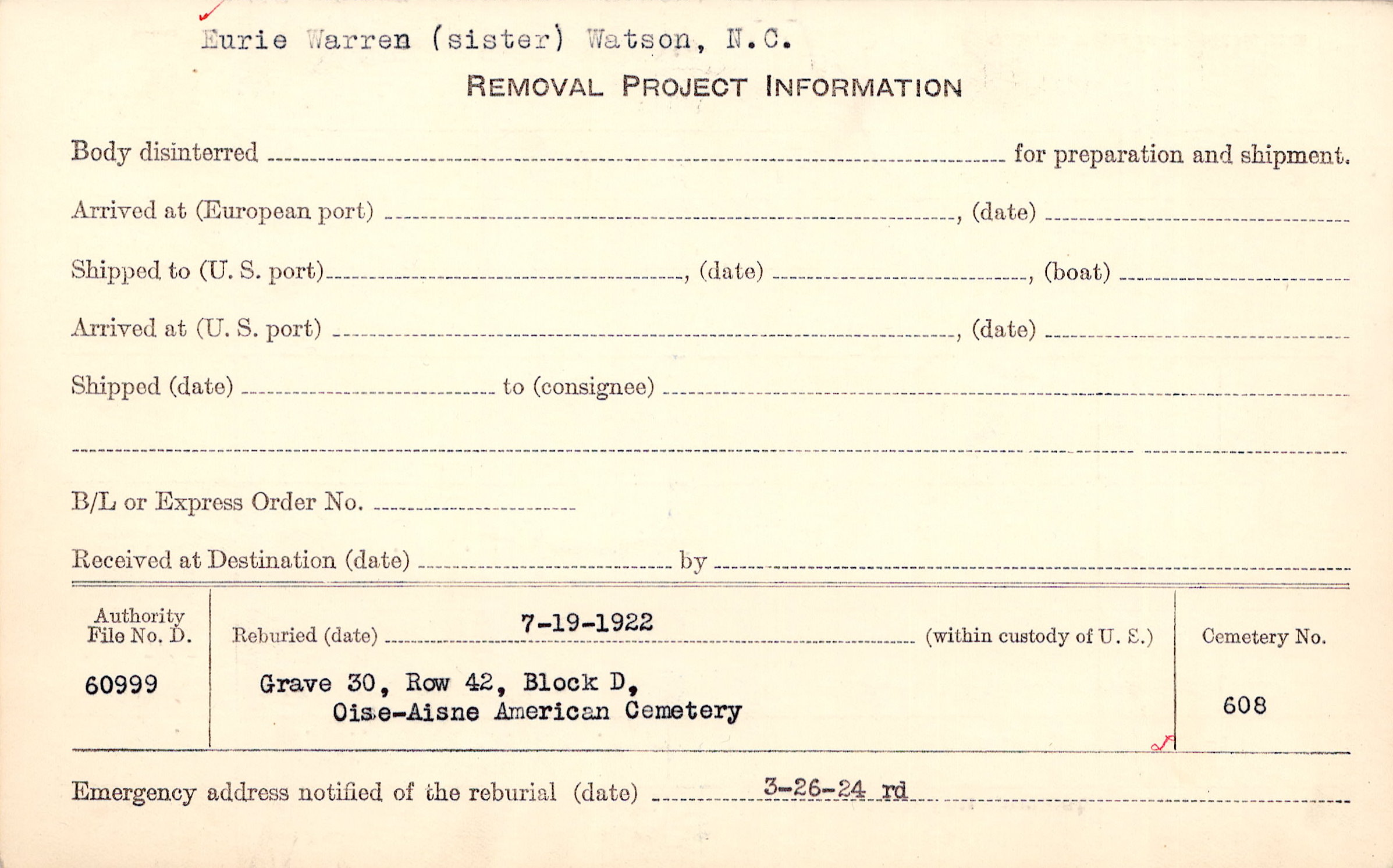 S. P. Warren, (Father), Topnot, N.C., Over. Deceased.