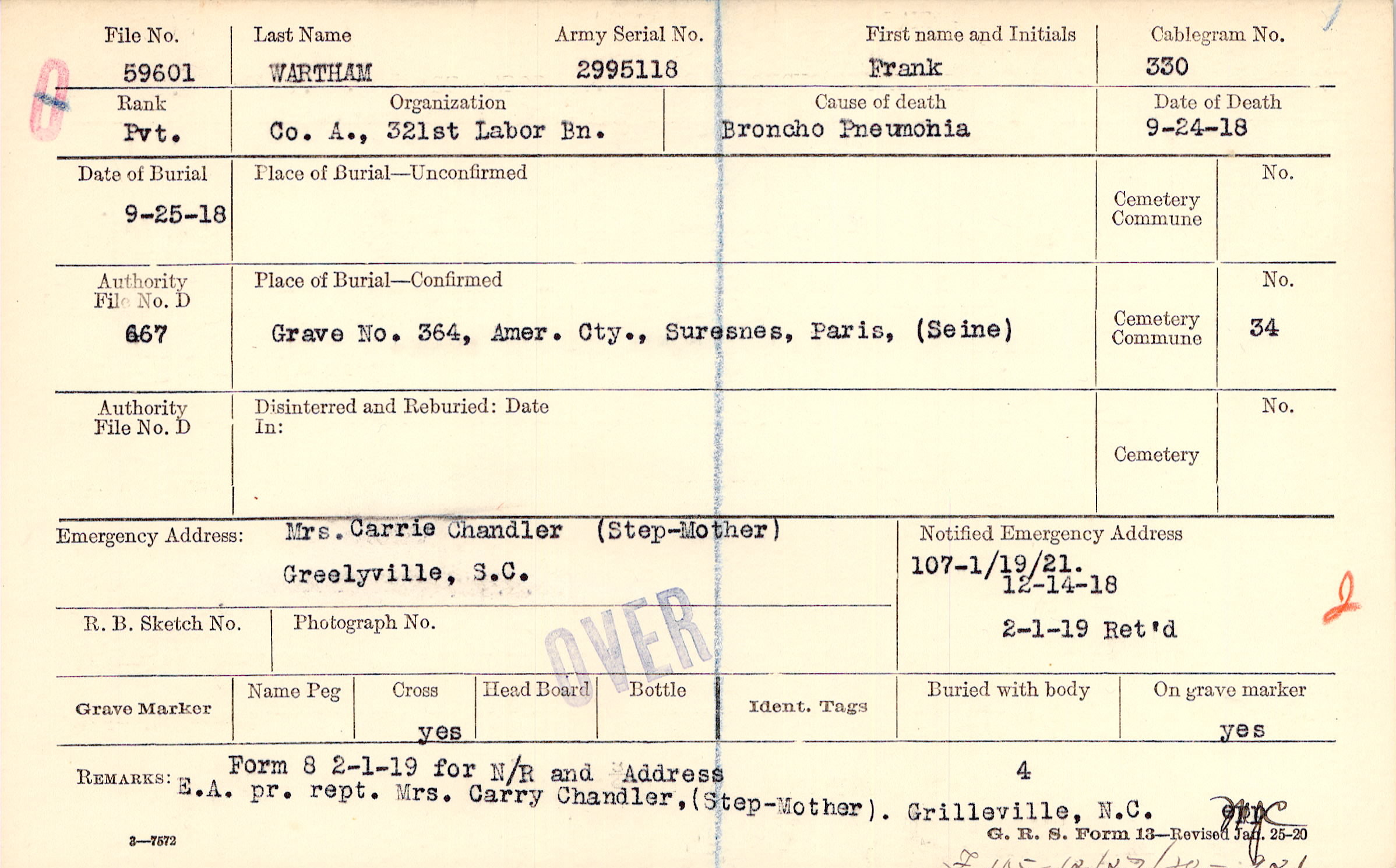 E.A. pr. rept. Mrs. Carry Chandler, (Step-Mother). Grilleville, N.C., Form 8 2-1-19 for N/R and Address, F 115 - 12/27/20 - 921