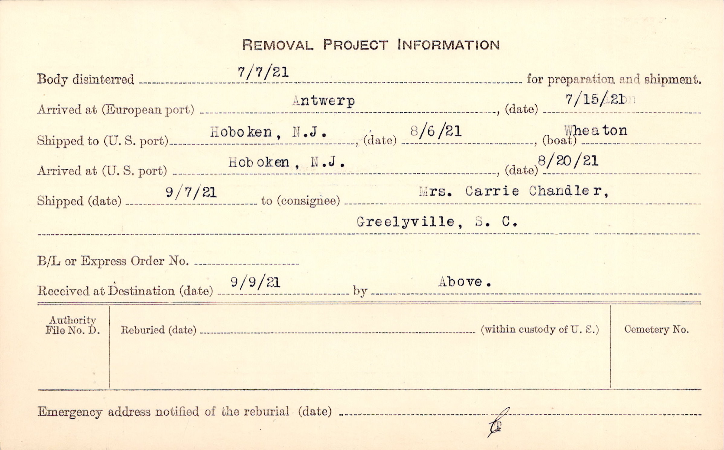 Body disinterred 7/7/1921 for preparation and shipment.