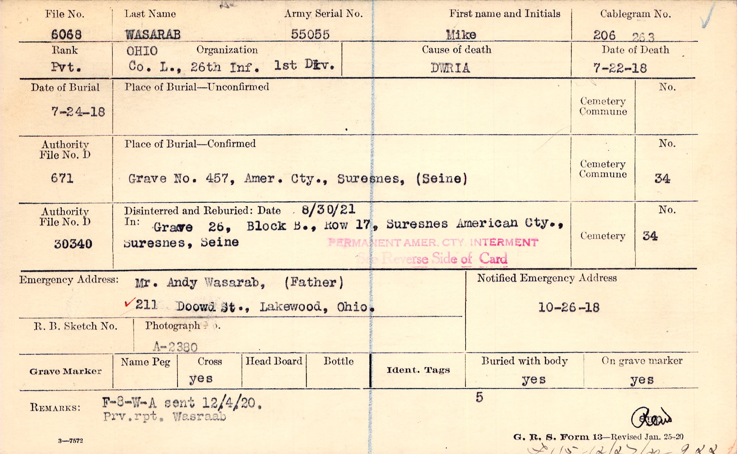 Mr. Andy Wasarab, (Father), 211 Doowd St., Lakewood, Ohio.