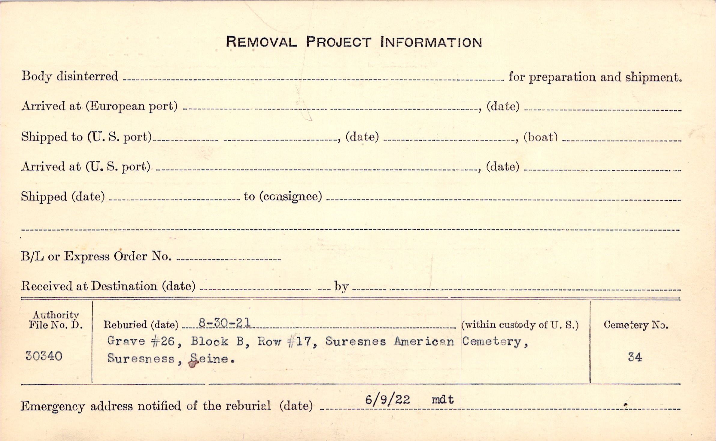 Grave 26, Row 17, Suresnes American Cemetery, Suresnes, Seine