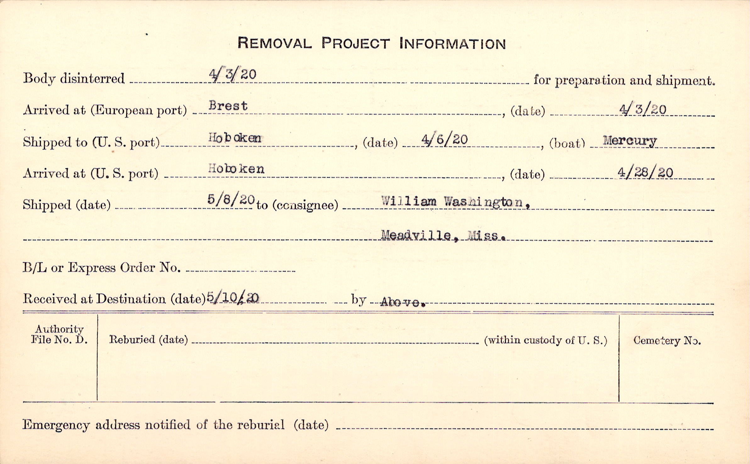 Body disinterred 4/3/1920 for preparation and shipment.