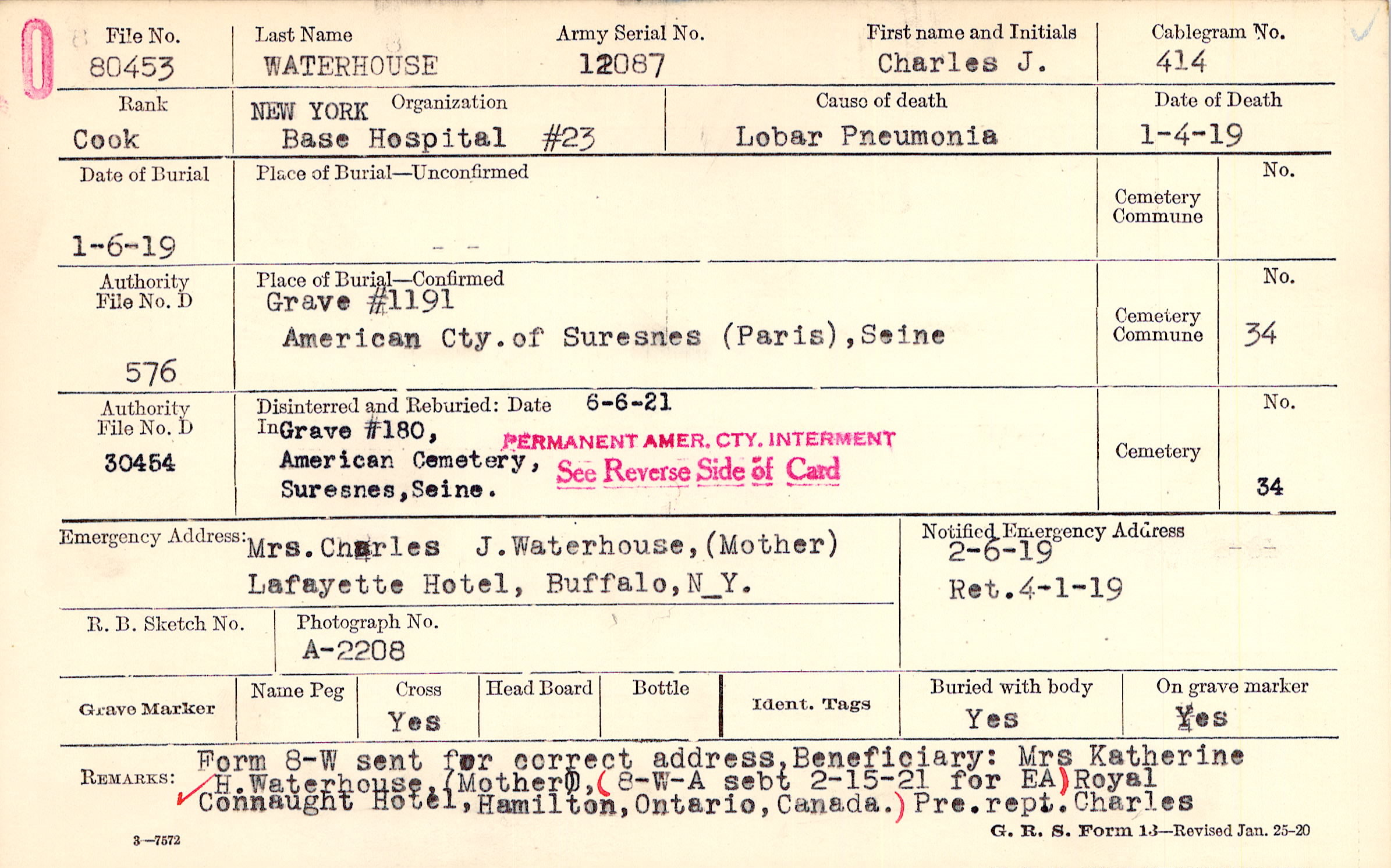 Mrs. Charles J. Waterhouse, (Mother), Lafayette Hotel, Buffalo, N_Y.