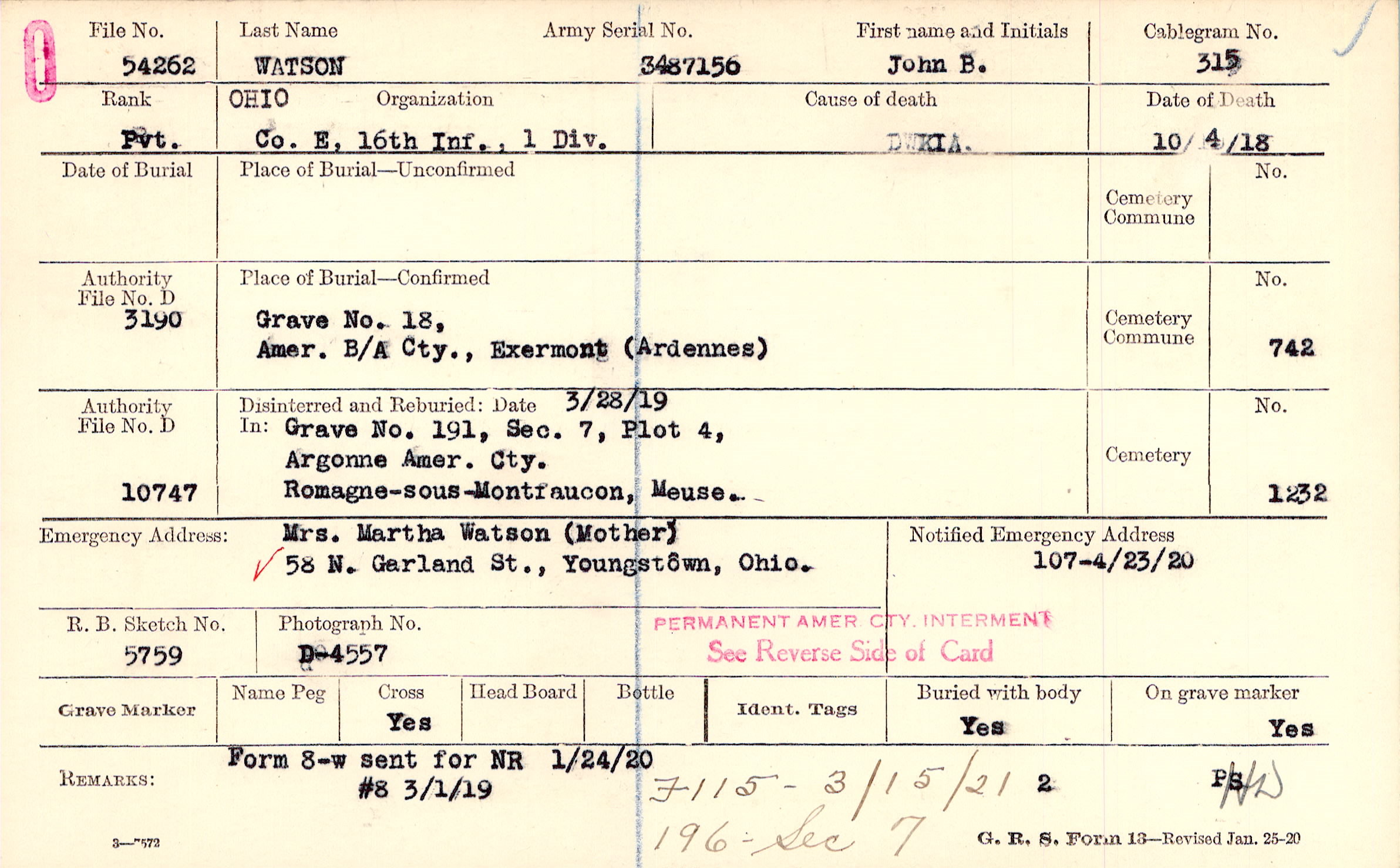 Mrs. Martha Watson (Mother), 58 N. Garland St., Youngstown, Ohio.