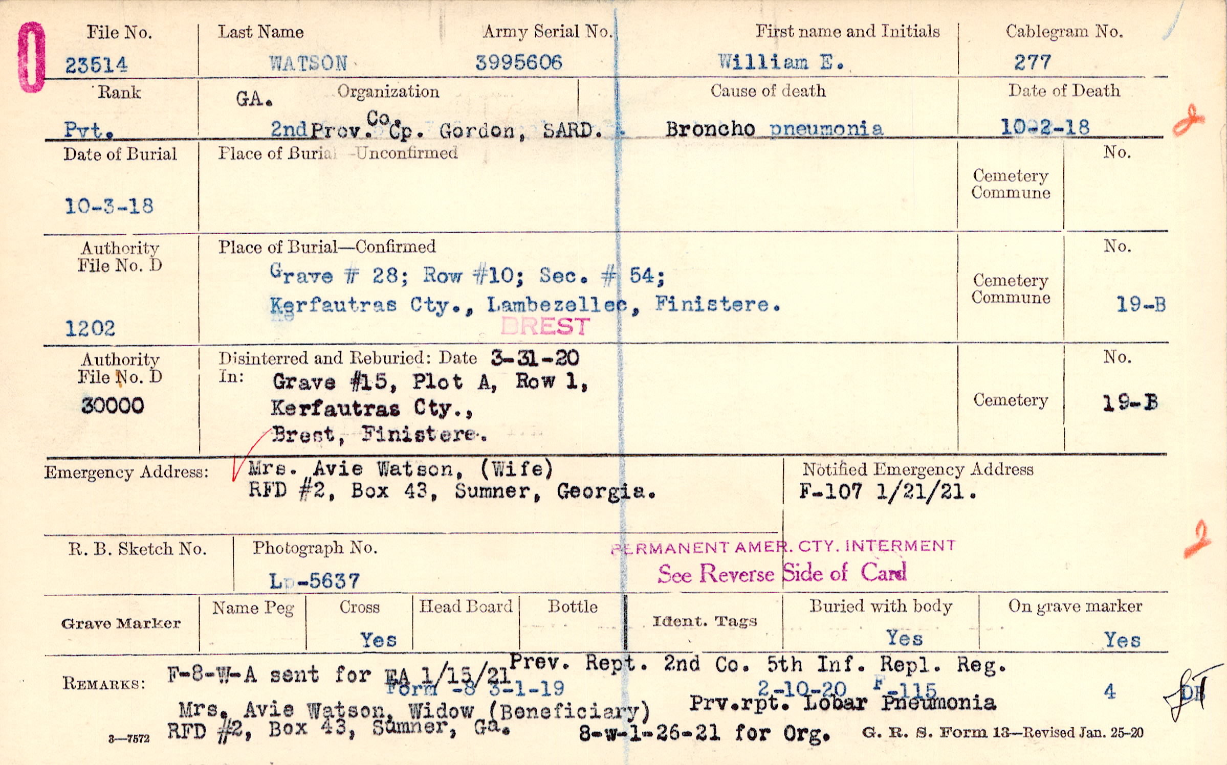 Prev. Rept. 2nd Co. 5th Inf. Repl. Reg. Mrs. Avie Watson, Widow ( Beneficiary), RFD #2, Box 43, Sumner, Ga. Prv.rpt. Lobar Pneumonia, F-8-W-A sent for EA 1/15/21 Form -8 3-1-19 8- w 1-26-21 for Org., 2-10-20 F-115