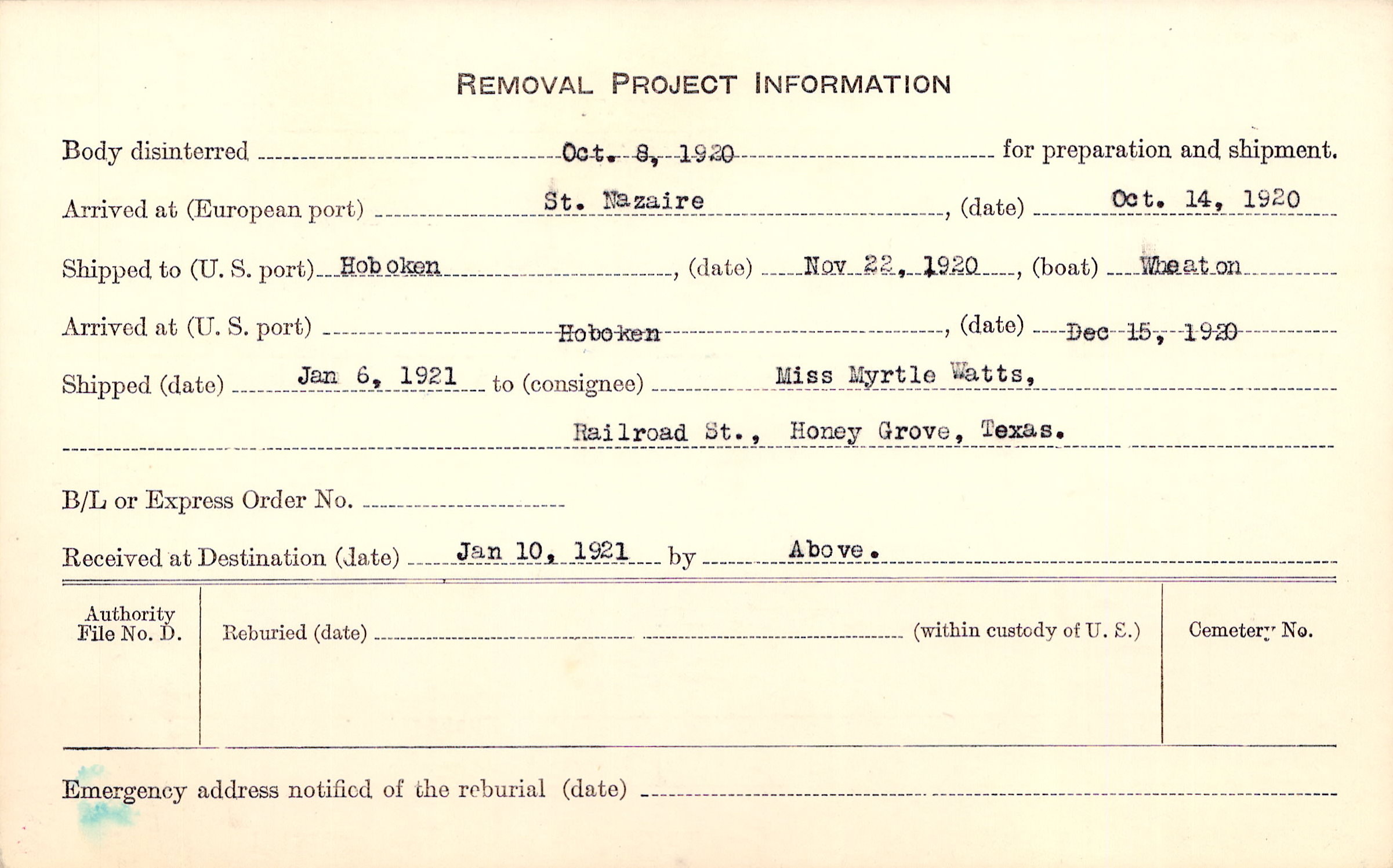 to Miss Myrtle Watts, Railroad St., Honey Grove, Texas.