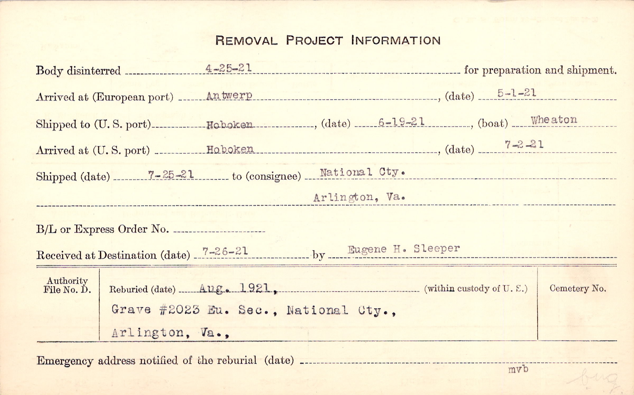 Body disinterred 4/25/1921 for preparation and shipment.