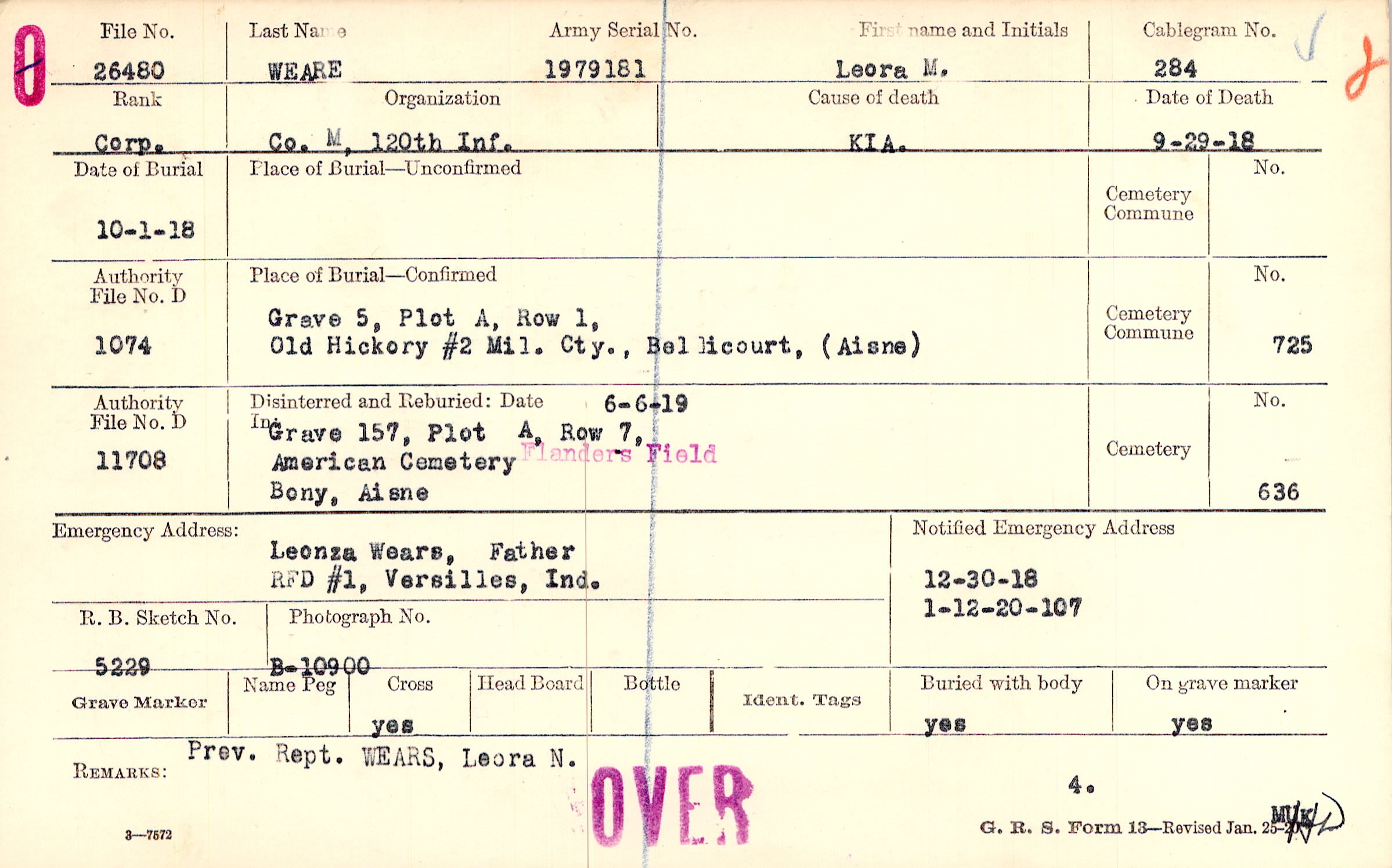 Leonza Wears, Father, RFD #1, Versilles, Ind., Prev. Rept. WEARS, Leora N.