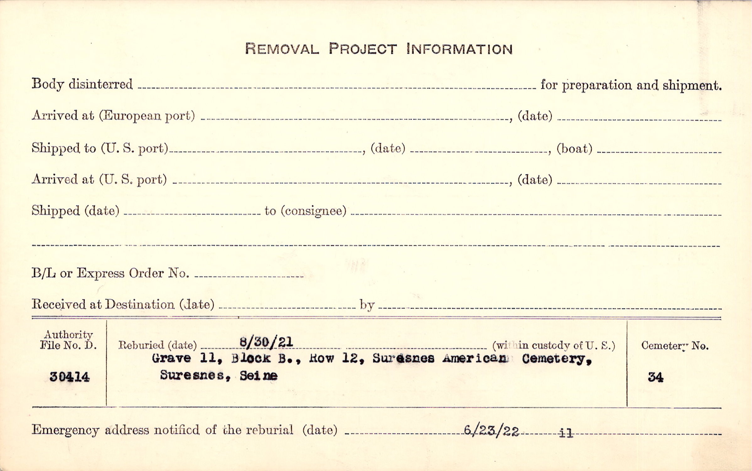 | Permanent Burial in Foreign Cemetery |