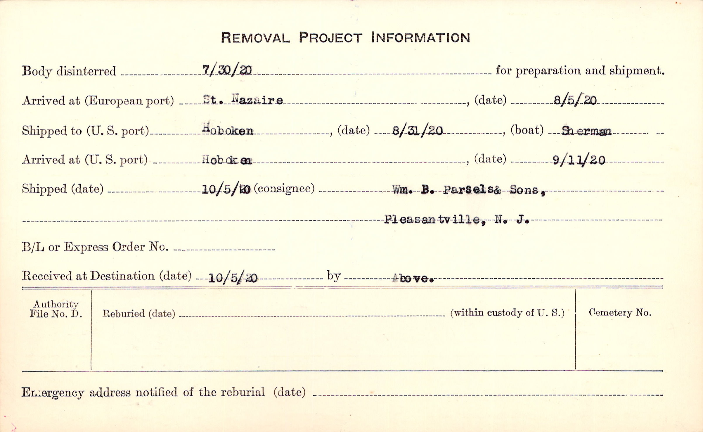 Body disinterred 7/30/1920 for preparation and shipment.