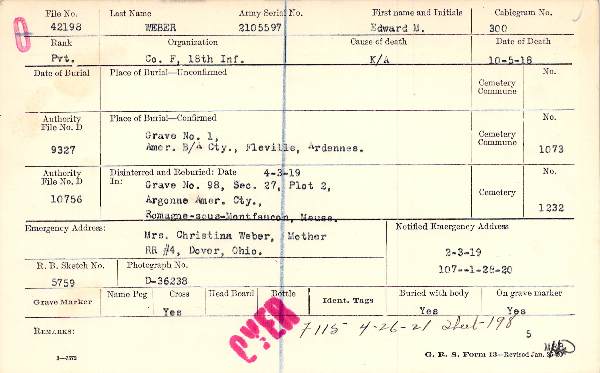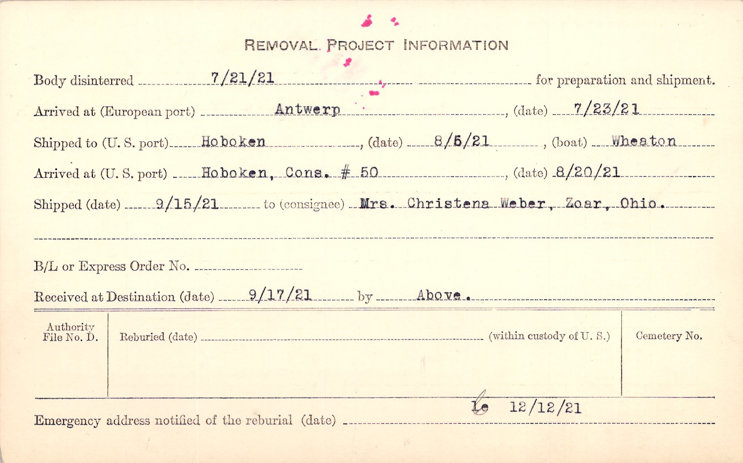 Body disinterred 7/21/1921 for preparation and shipment.
