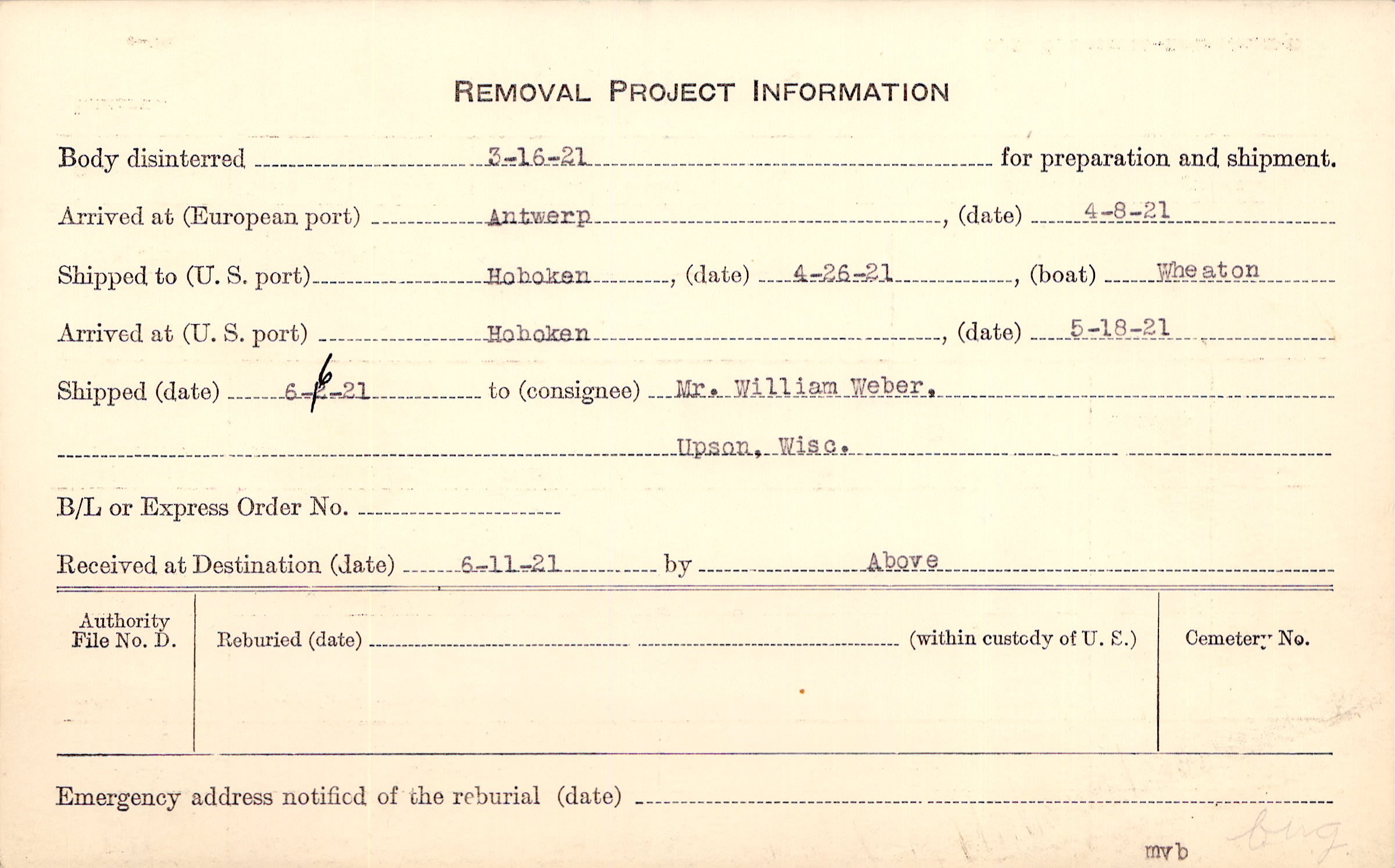 Body disinterred 3/16/1921 for preparation and shipment.