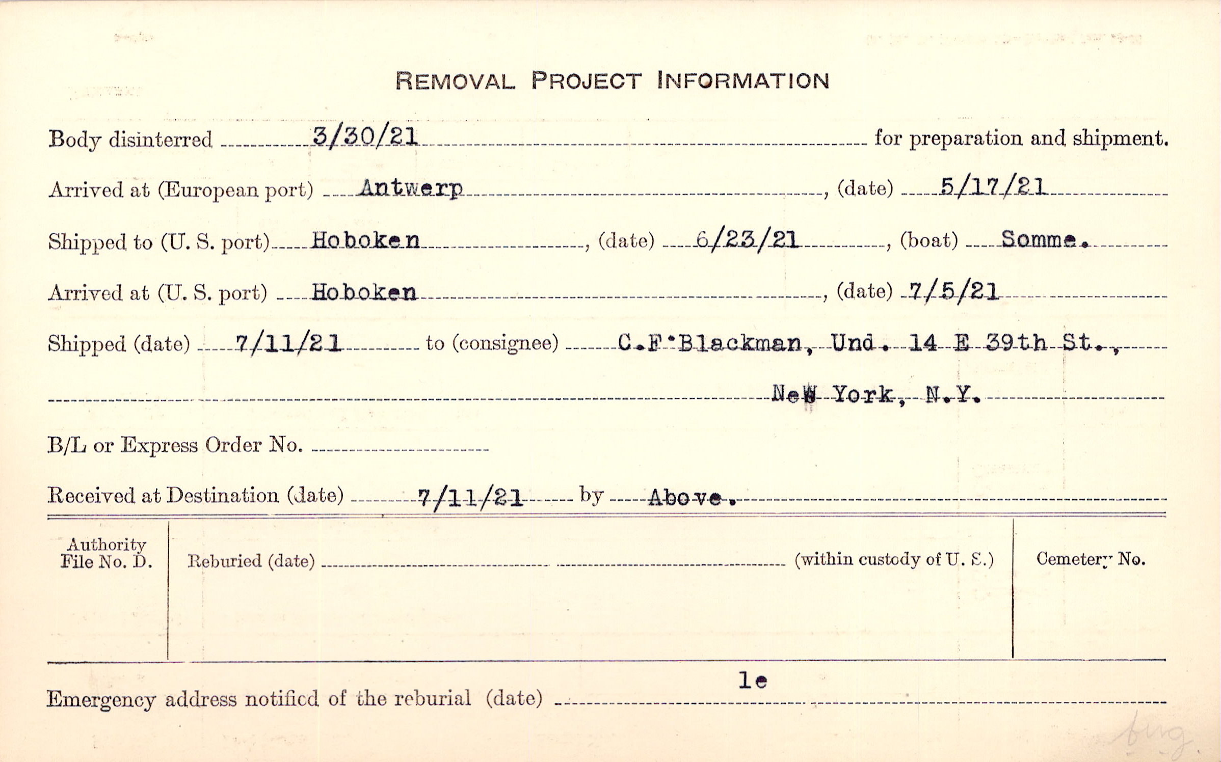 Body disinterred 3/30/1921 for preparation and shipment.