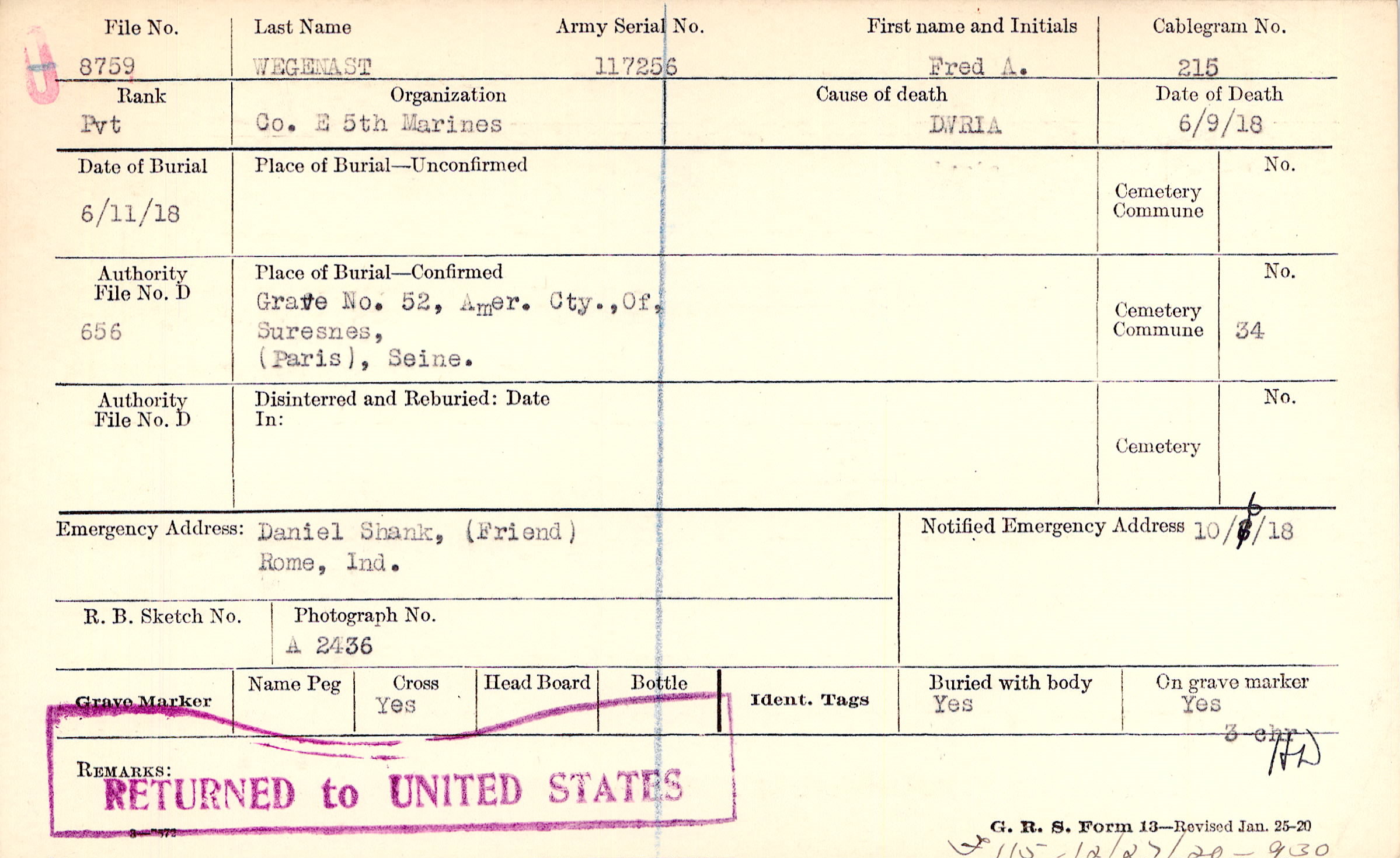 Grave 52, Amer. Cty. of Suresnes, Paris, Seine.