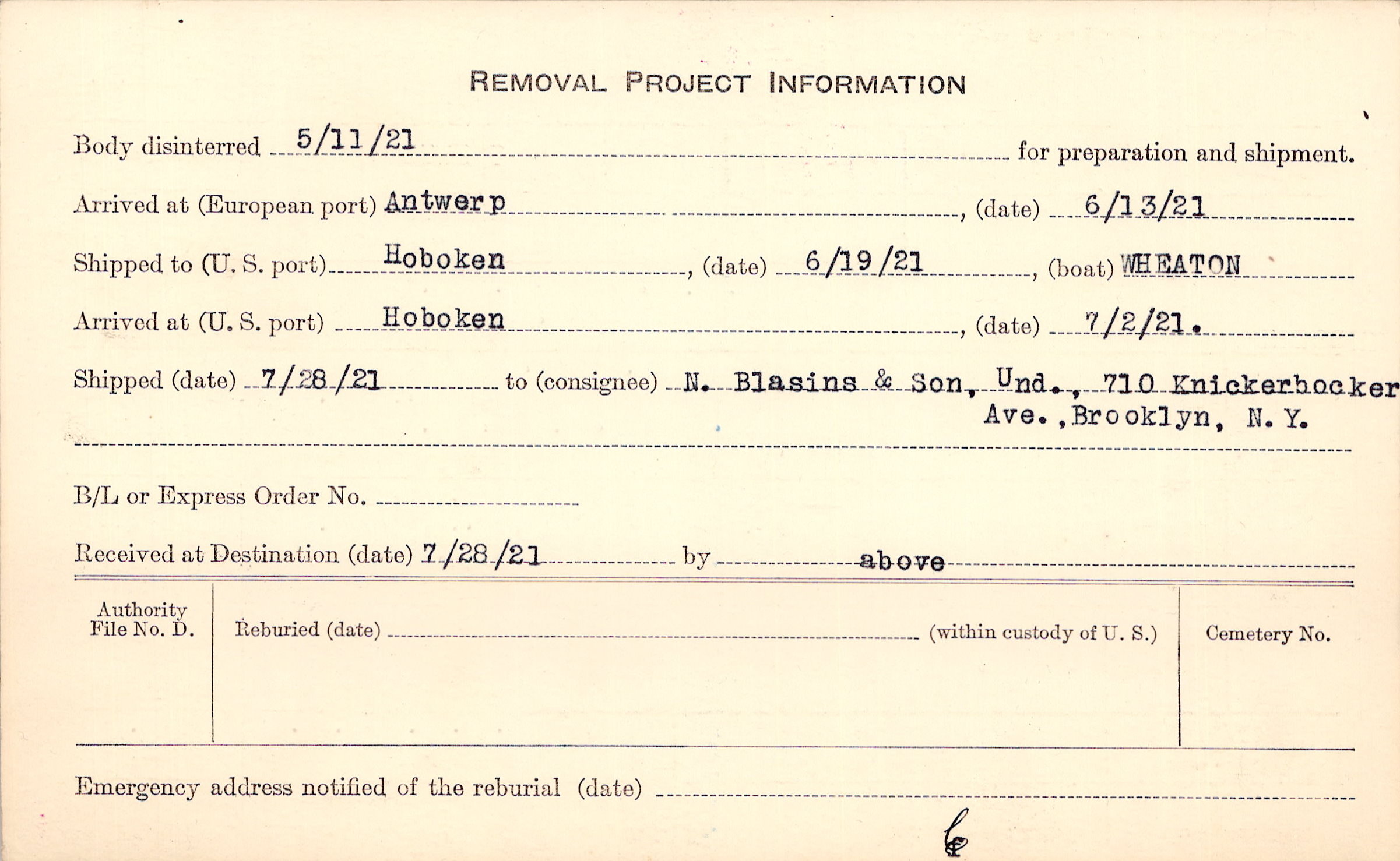 Body disinterred 5/11/1921 for preparation and shipment.