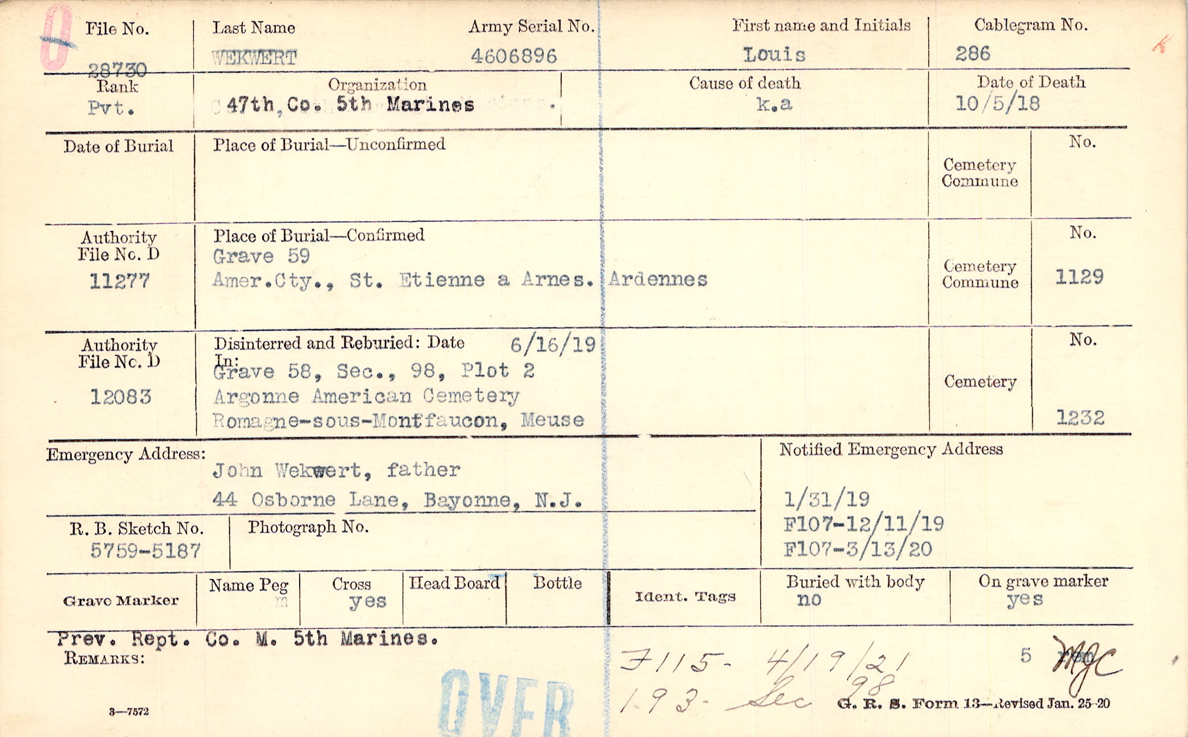 John Wekwert, father, 44 Osborne Lane, Bayonne, N.J.