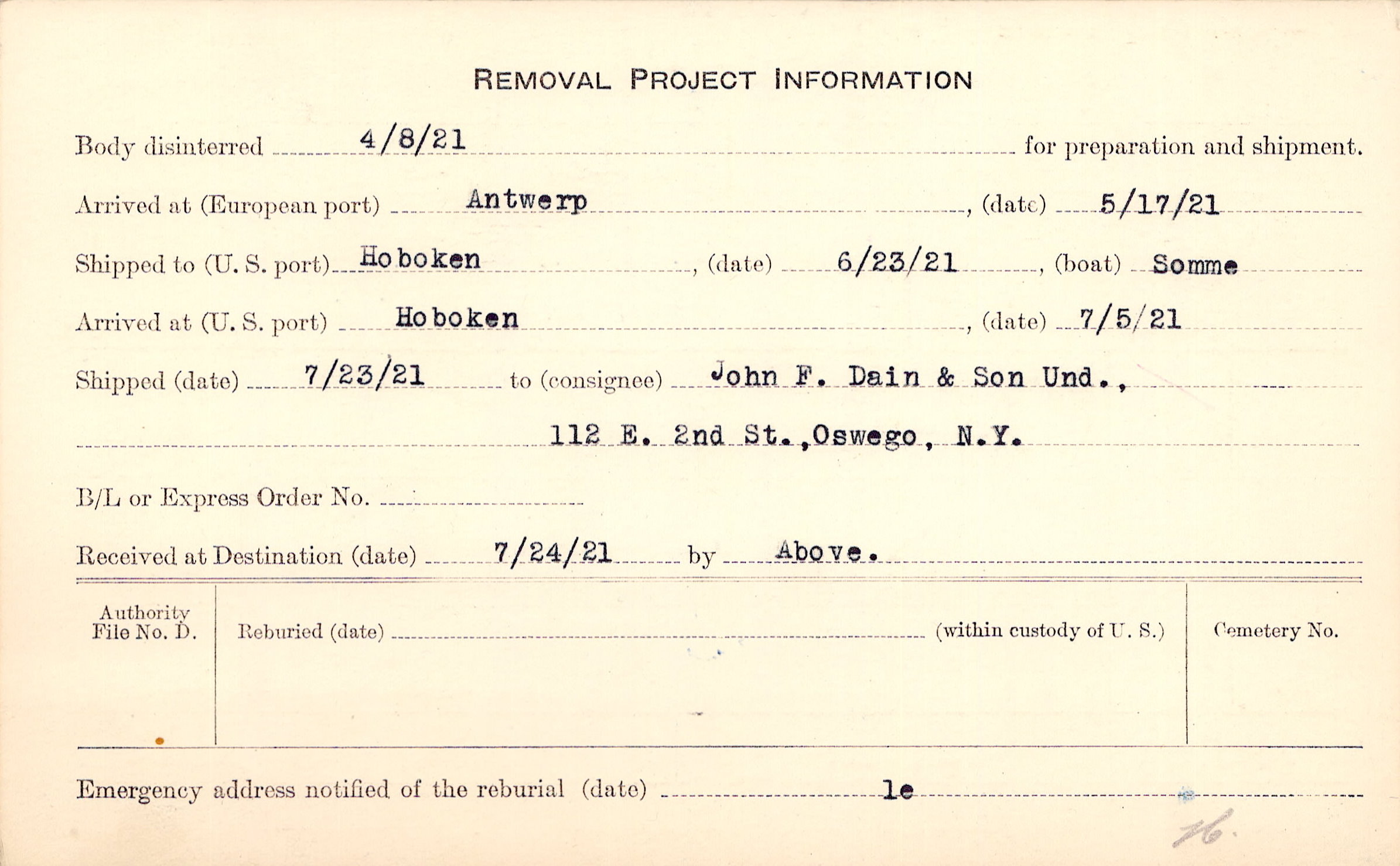 to John F. Dain & Son Und., 112 E. 2nd St., Oswego, N.Y.
