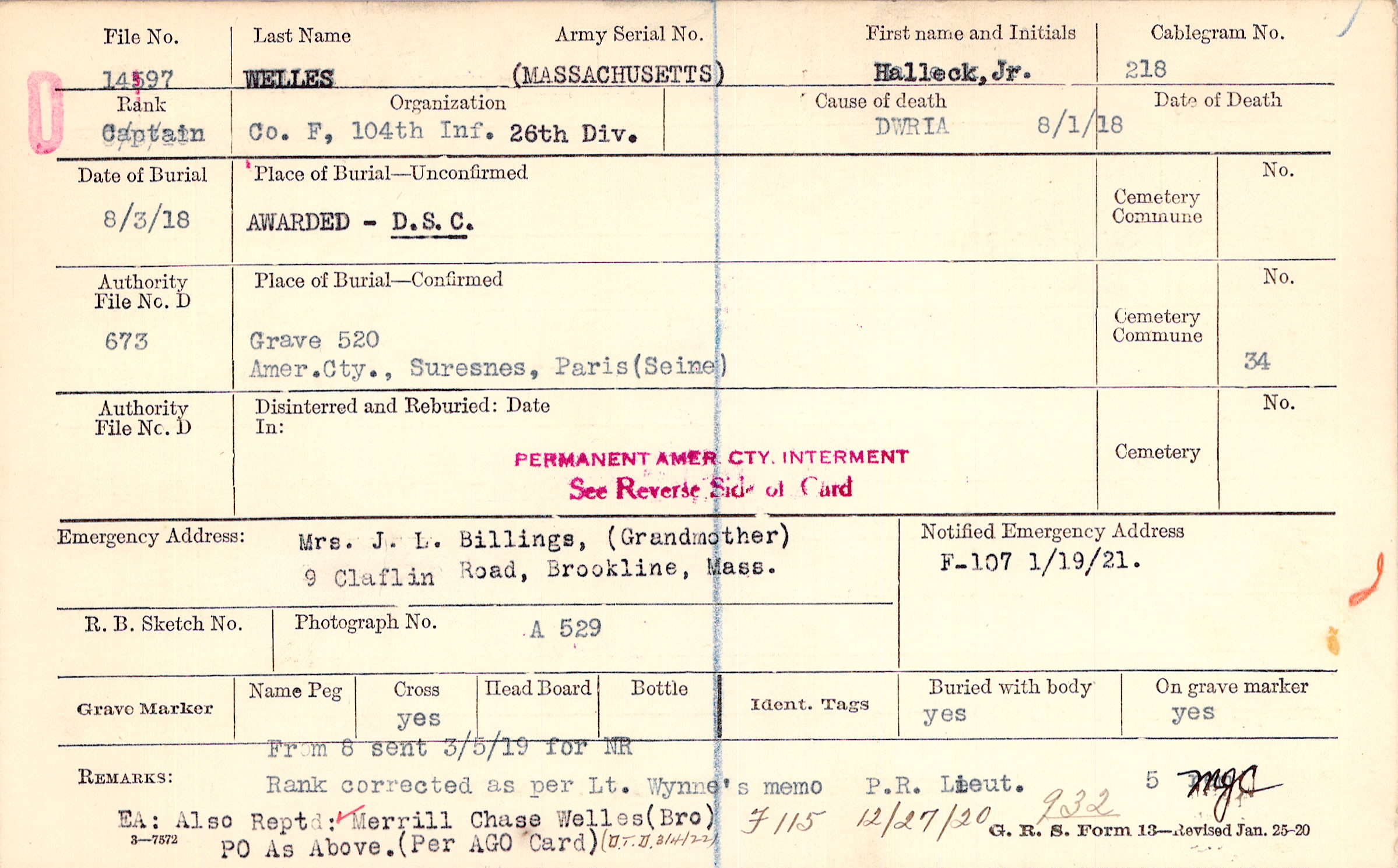 Fr m 8 sent 3-5-19 for NR Rank corrected as per lt. wynne's memo P.R. Lieut EA: also Rept: Merrill chase welles (Bro) PO as above. (Per AGO Card), From 8 sent 3/5/19 for NR, F115 12/27/20 932