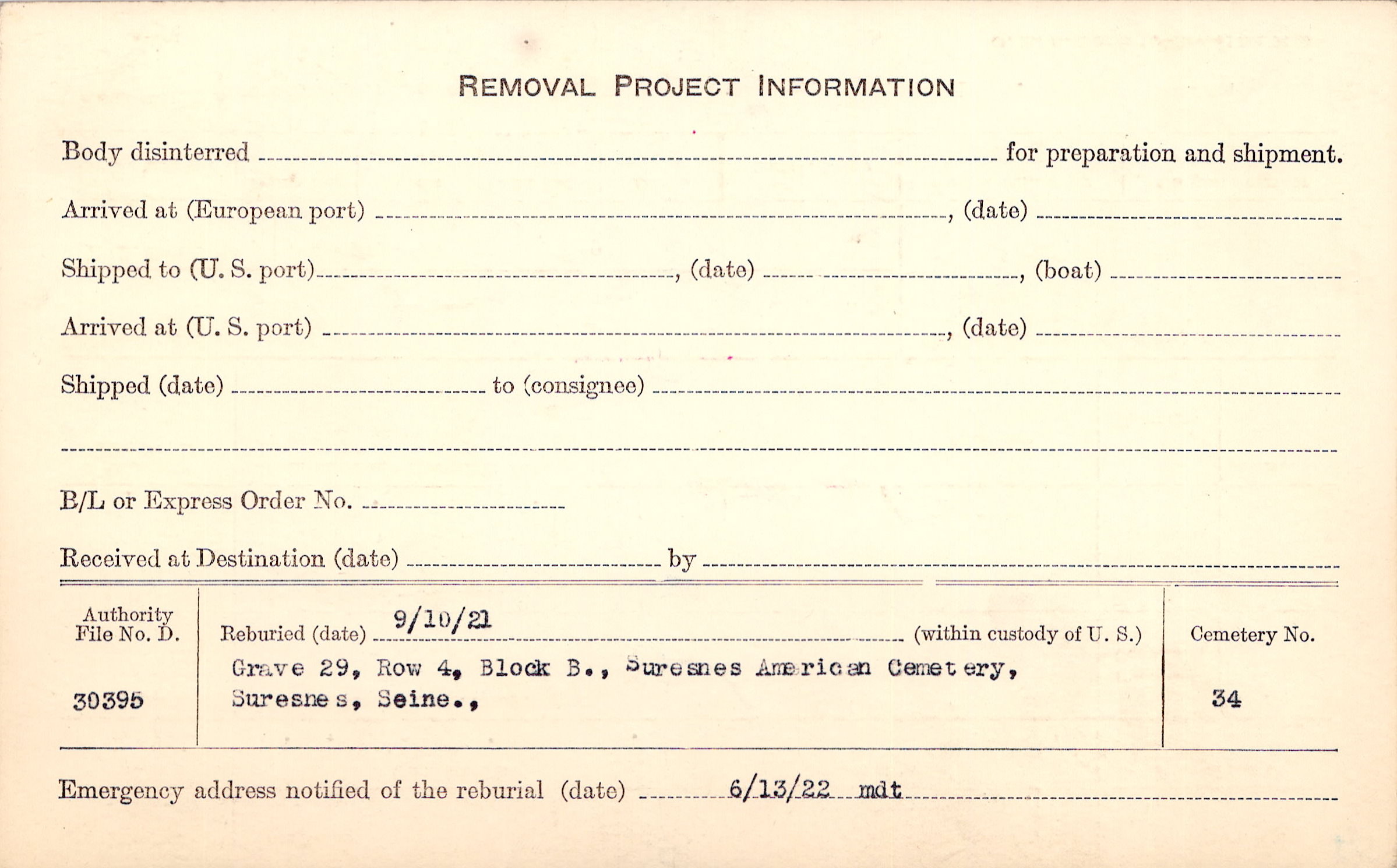 | Permanent Burial in Foreign Cemetery |