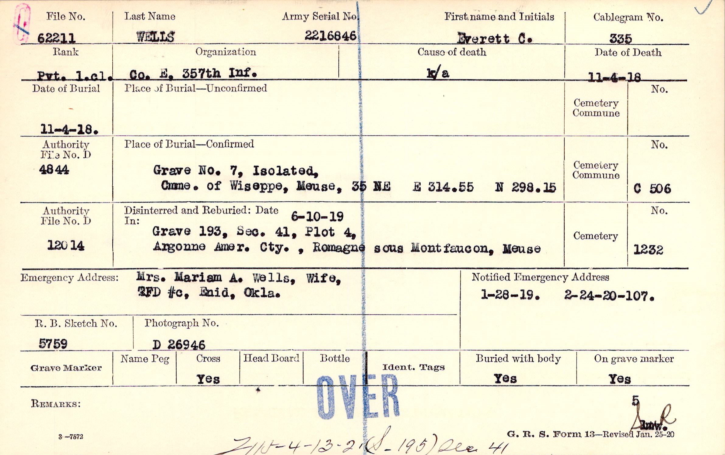 MRs. Mariam A. Wells, Wife,, 2FD #c, Enid, Okla.