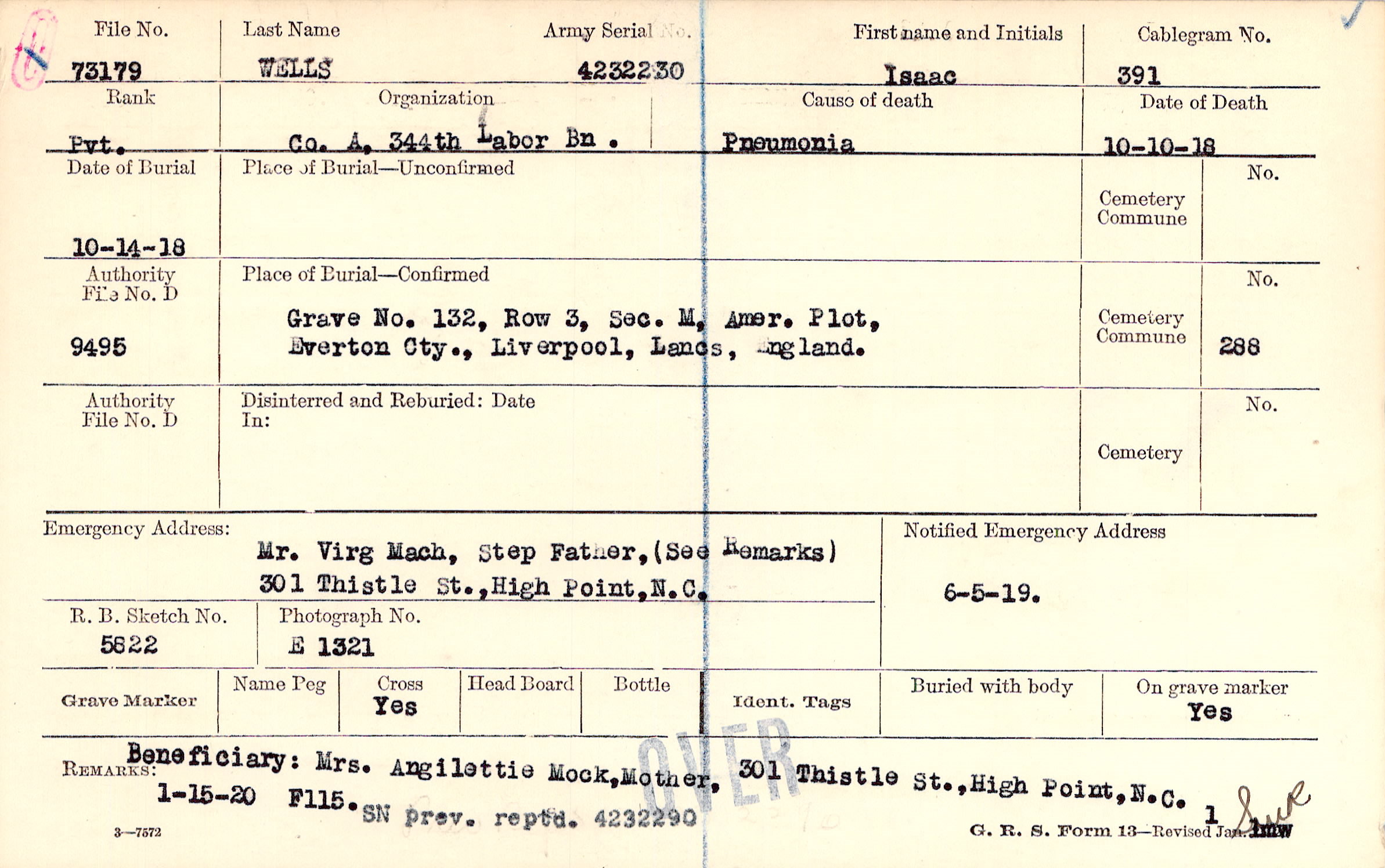 Grave 132, Row 3, Sec. M., Amer. Plot, Everton Cty., Liverpool, Lancs, England.